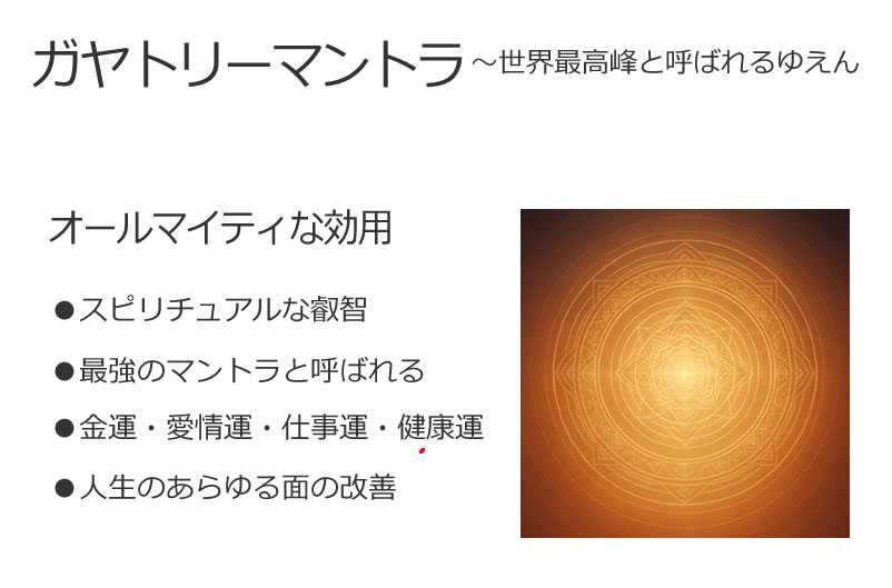 ガヤトリーマントラ(Gāyatrī Mantra。ガーヤトリーマントラ、ガヤトリマントラとも)は、ヒンドゥー教における最高峰のマントラとされ、ヴェーダ聖典のエッセンスすべてを含むと言われている古いマントラです。このマントラは、もともと『リグ・ヴェーダ』3.62.10 に登場する詩節で、太陽神サヴィトリ(Savitṛ)を讃えるものです。かつては上位階級のバラモンだけが唱えることを許されていた神聖なものですが、インドの聖者サイババ師が一般庶民に公開したことで、世界的に知られるようになりました。現在では、精神の浄化・祈り・開運・ヒーリングのために、世界中の多くの人々が唱えています。特に女神としてのガーヤトリーも信仰されており、五つの頭を持つ智慧の象徴とされる姿でも知られています。■マントラの原文と日本語訳オーム宇宙の根源、神聖なる始まりの音ブール ブワッ スヴァハ物質界、心の世界、因果の世界に満ち満ちているタット サヴィトゥル ヴァレーンニャム至高たるサヴィトリの実在を讃えますバルゴー デーヴァッスヤ ディーマヒ聖なる真理(バルグ)の輝きを深く瞑想しますディヨー ヨー ナッ プラチョーダヤートかの叡智によって、我らの思考が啓発されますように■幅広くオールマイティな効能心の平穏と集中力の向上スピリチュアルな叡智へのアクセスストレス解消・ネガティブな気持ちの払拭と癒し「ながら詠唱」でも開運(掃除・歩行・入浴中など)世界最強の開運マントラとまで言われる金運、愛情運、仕事運、健康運などオールマイティーな効果「人生のあらゆる面が改善される」とも。 ■私の体験とおすすめの唱え方私はこのガヤトリーマントラを、毎日欠かさず唱えています。あまり人と話す時間が少ない生活をしている方には、喉を動かす健康法としてもおすすめです。自然な発声練習にもなって、結果として声が通るようになります。実際に私は、これを続けているうちにカラオケで驚くほど声が出やすくなったし、気分が沈むようなときも、このマントラを口ずさむことで、気づけば穏やかな気持ちに戻ります。何よりも大きいのは、「運命の流れが変わった」と感じるような転機が、マントラ詠唱を習慣にし始めてから訪れたということでしょう。■音声で聴いて開運するYouTubeなどでは、サイババ師がこのマントラを108回詠唱している動画が公開されており、非常にパワフルで浄化的な響きを体験できます。「唱える時間が取れない」という人でも、朝の支度中、通勤中、料理中など、日常生活のなかで小さい音量で常に再生しておくだけでも大きく開運したという体験があるいは日常の些細なことでも良い方に流れるというようなことがネット上でも多く見られます。ぜひ、ガヤトリーマントラの光をあなたの日常に取り入れてみてください。心も空間も、明るく変化していくのを感じるはずです。💫ॐ भूर्भुवः स्वः(ナマステ) 追記:ナマステの意味ナマステ(namaste) は、サンスクリット語の「नमस्ते(namas + te)」から来ていて、namas(ナマス):敬礼・礼拝・感謝te(テー):あなたにつまり、「あなたに敬意を捧げます」「あなたの中の神聖に感謝します」という意味になります。ヨガやスピリチュアルの世界では「私の中の神が、あなたの中の神に挨拶します」って解釈されることも多いですね