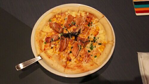 昨日の夜は、カラオケ、ビッグエコー円座店。お腹が空いたのでピザ。照り焼きチキンピザ1015円、意外といける!