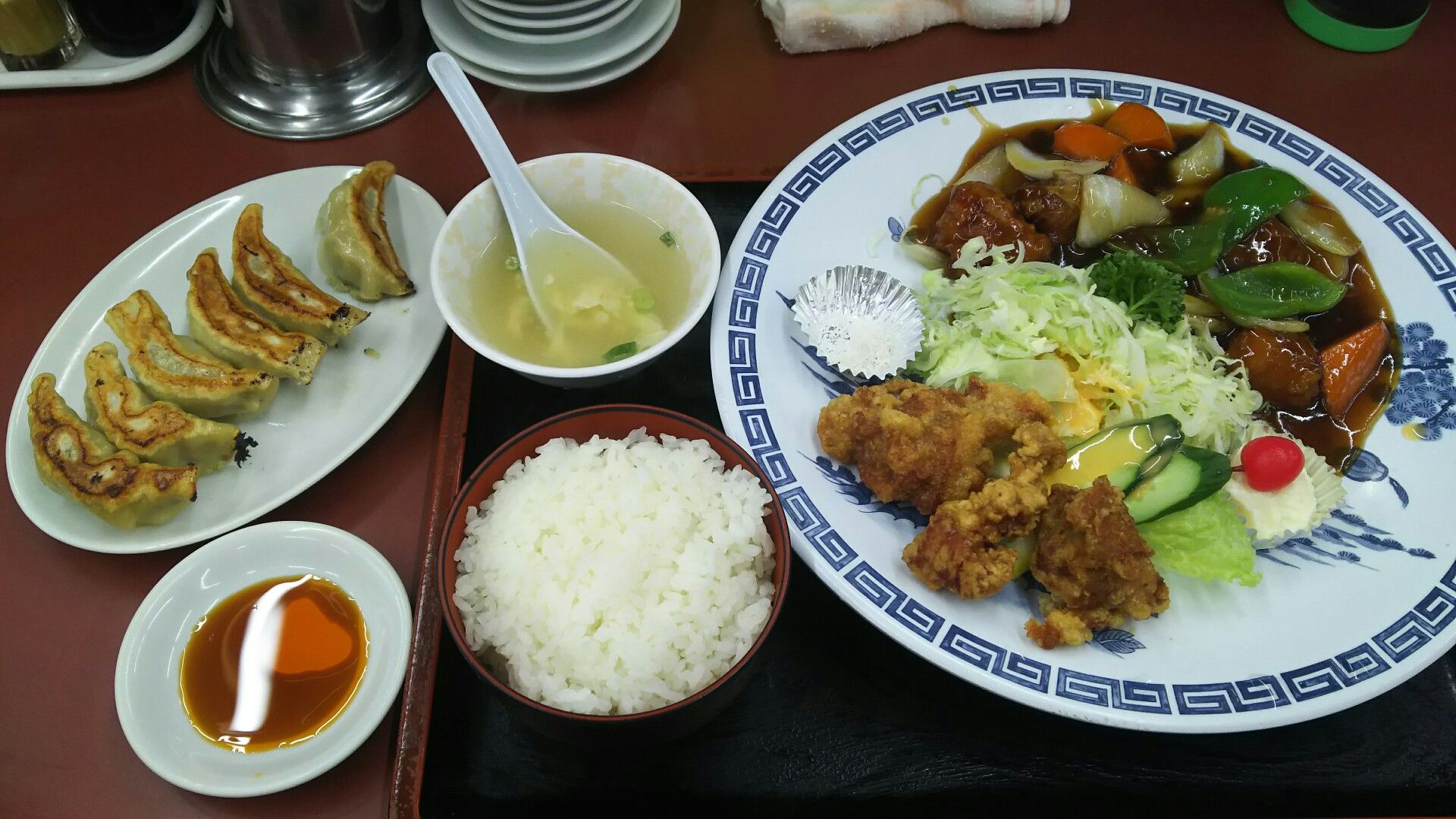昨日の夜は、宇多津の旧国道沿いの中華まんぷく亭。Bから揚げ・酢豚定食中690円(税別)+まんぷく餃子250円(税別)。 ドンドン餃子のチェーン店の遺伝子を受け継いでおり量は多い。にんにく入りで普通の餃子より高いまんぷくは餡がたっぷり美味しい。
