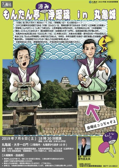 文楽が好きだ。その文楽から人形を抜いて毎年8月に塩飽広島で行われてた太夫と三味線だけの「もんたん亭浄瑠璃」のことも何度か書いた。 そのもんたん亭が今年はなんと丸亀城の大手門で7月6日(土)に開催とのこと。 一方で、私が城好きなことも何度も書いてきた。だから城に関係ないイベントを城内で行うことは好きでない。 大手門での浄瑠璃って、この考えからはかなり微妙。建物は使わないと傷むからと文化財保護の一つと割り切るしかないのかな。