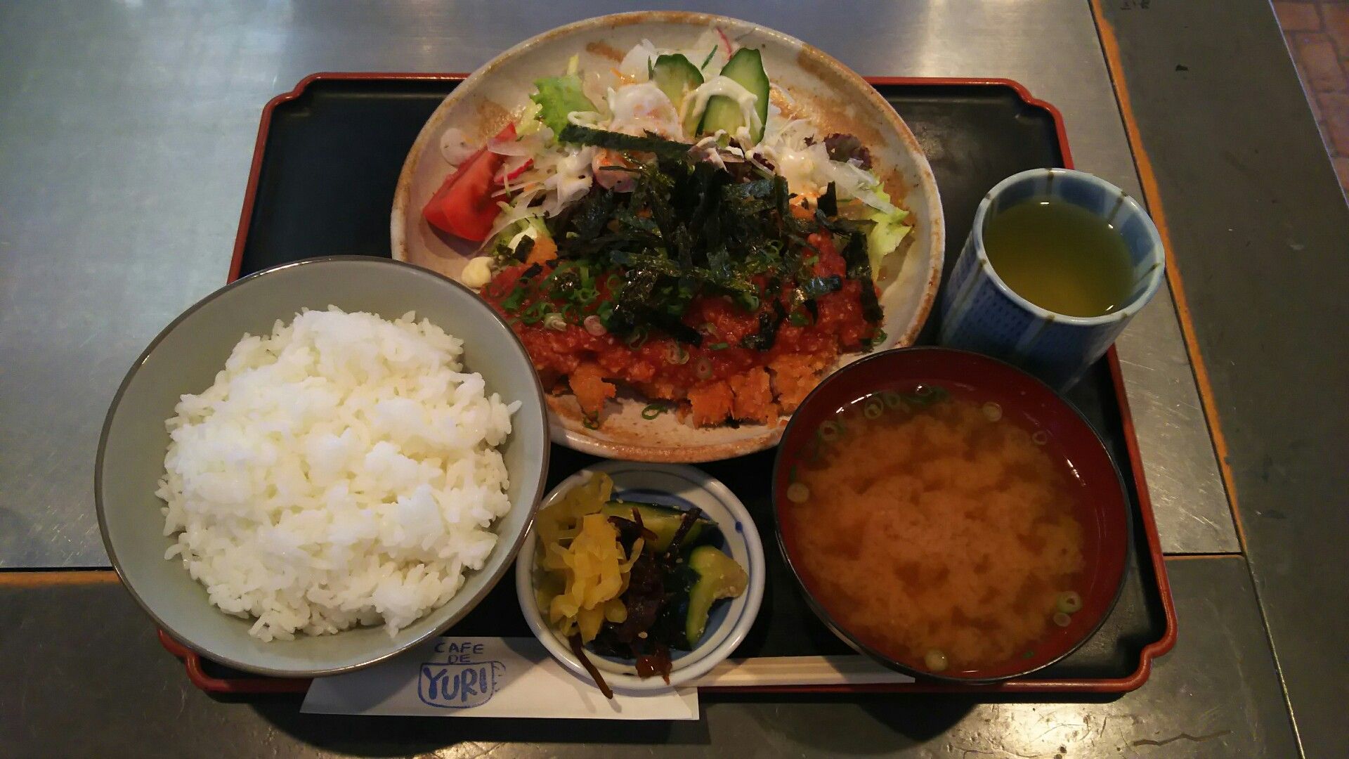 昨日の夜は、善通寺の旧の方の319号沿いの昭和36年創業のCAFE DE YURI 。 お肉を切るところから始める手作りの味とのキャッチがあった和風豚カツ定食880円。 ぱっと見も豪華な定食。豚カツも海苔がかかって和風ぽい(笑)。 歴史を感じる昔ながらの喫茶。