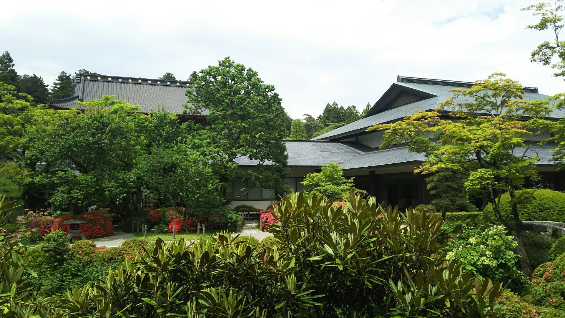逍遙園から宝物殿を望む。遠くの屋根は改修された三仏堂。