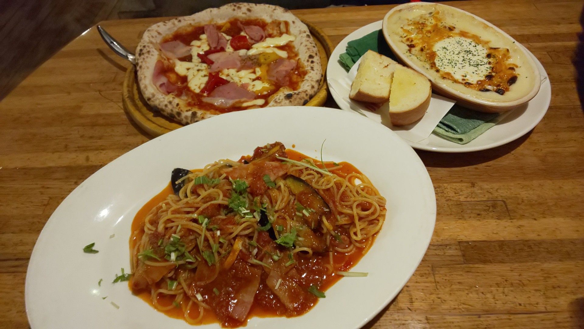 3人で2人分のサラダにパスタにピザのセット(3600円税別)とグラタン(880円税別)。