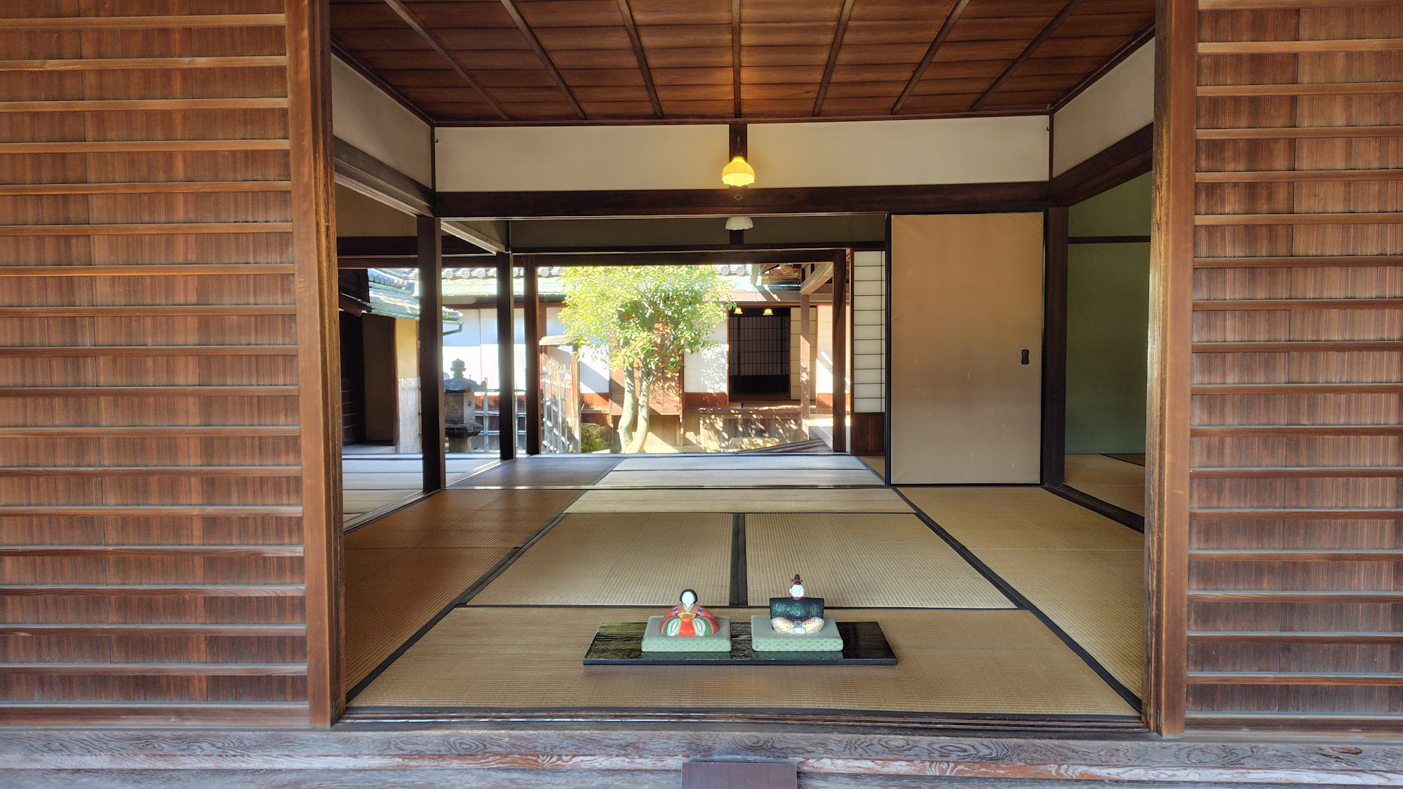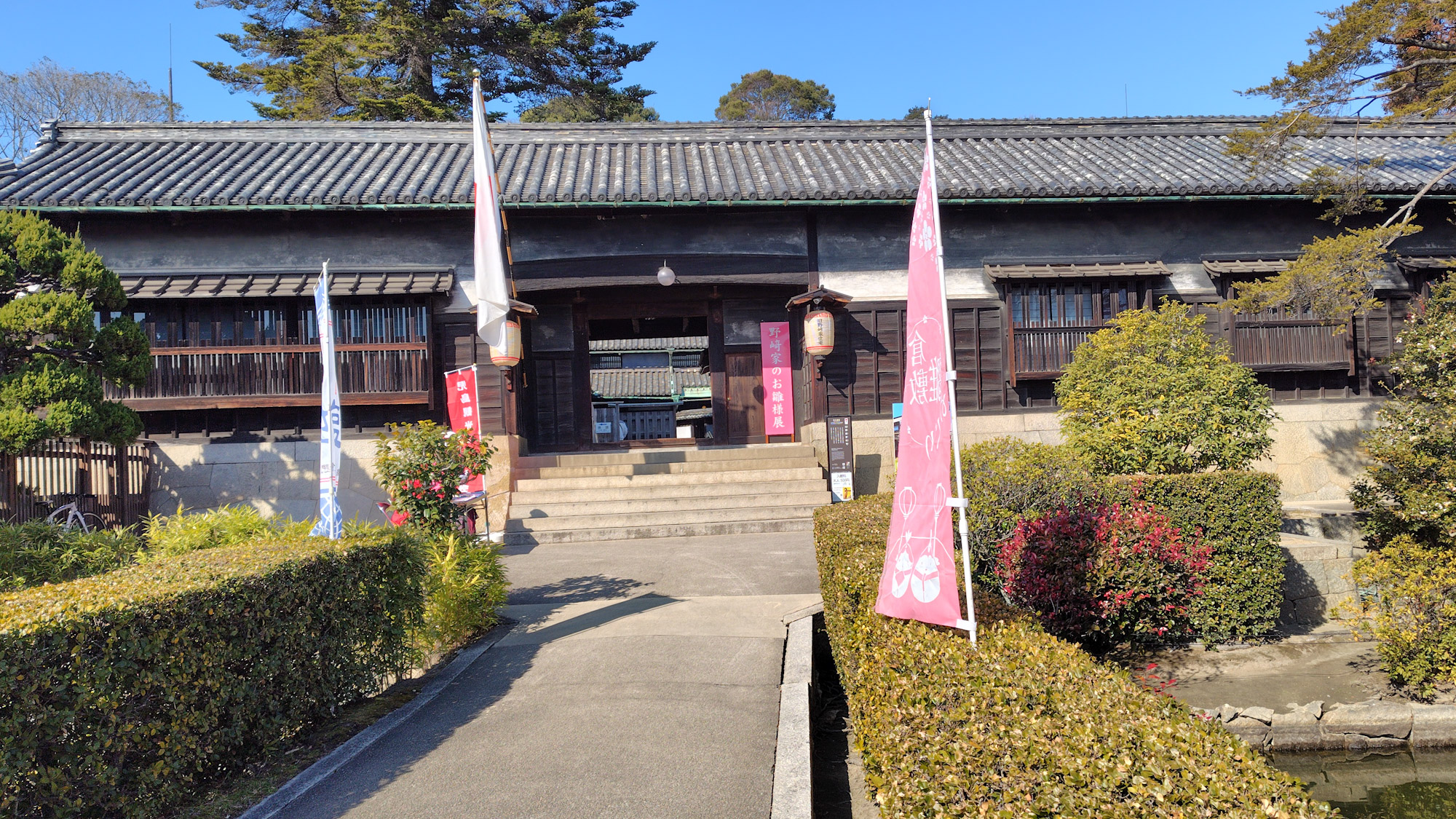 長屋門から入り、玄関、御成門、表書院、茶室、主屋、台所、味噌蔵、岡蔵、大蔵と見る。