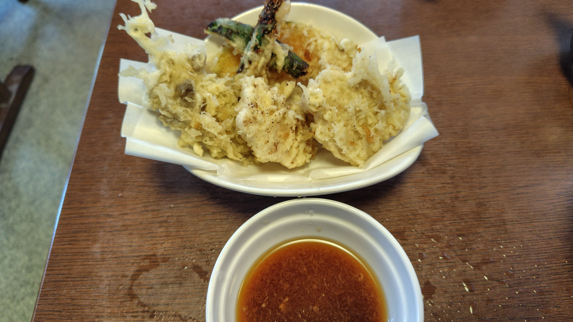ねじれはなくてちょっと太めしょうゆうどんらしい麺かな。かき揚げが名物らしいけど、油が多すぎと選んだとり天って、海老の代わりにとり天の立派な天ぷら盛り合わせ(笑)。