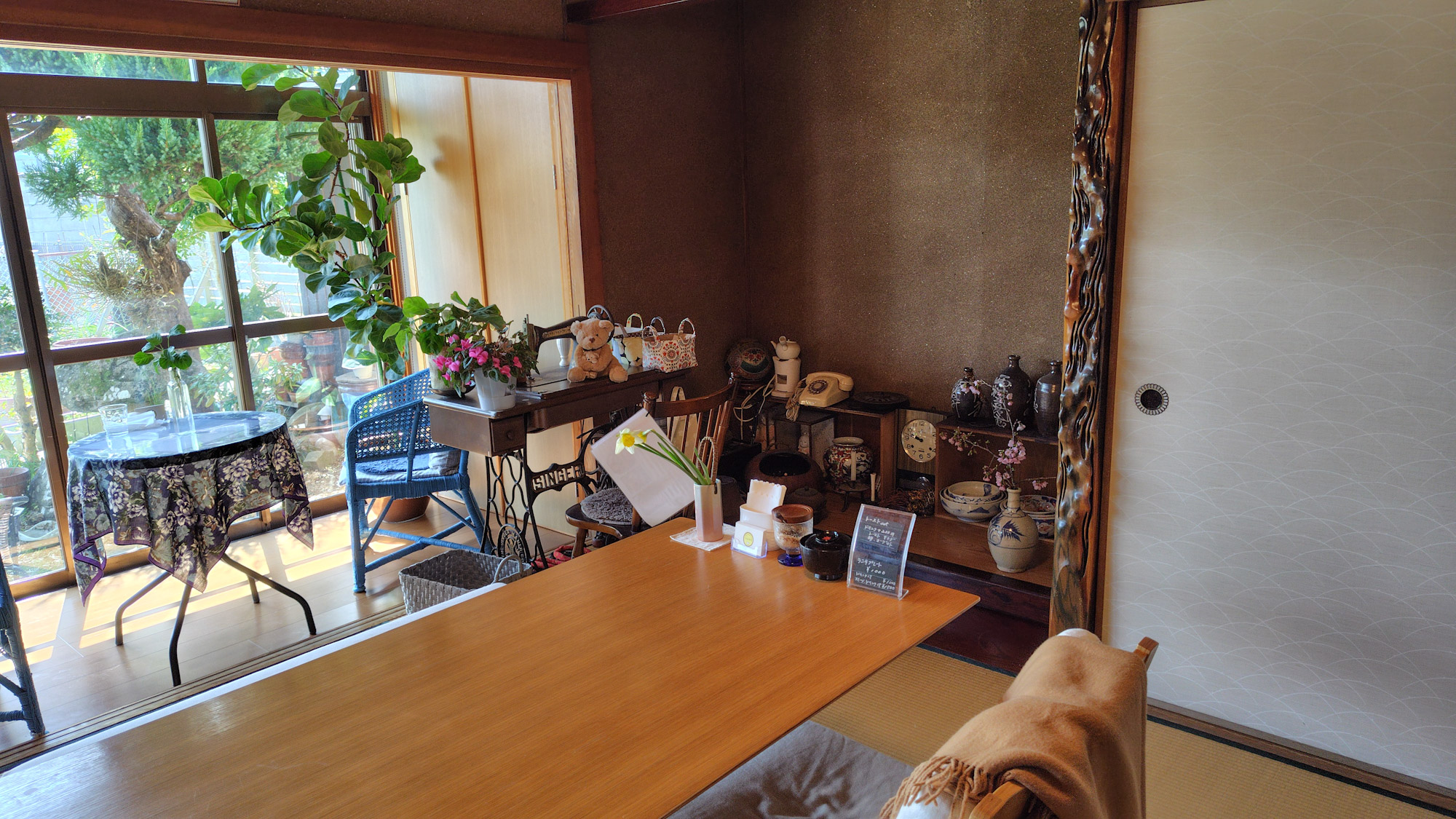着いたとき「closed」の札が掛かってて、あちゃーと思い尋ねたら忘れてた〜とのこと。玄関から靴を脱いでスリッパに履き替え和室に。テーブルが置いてある。
