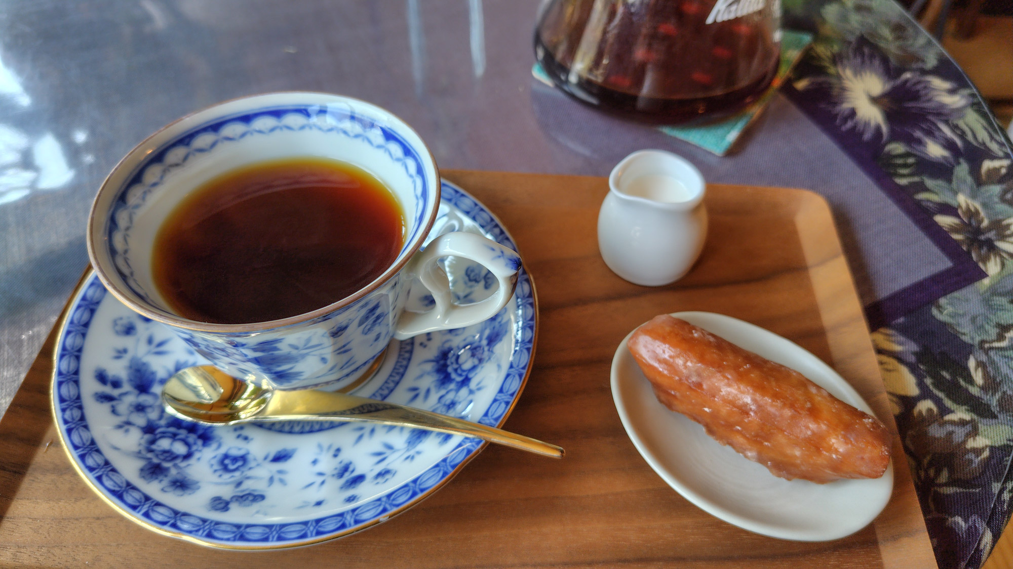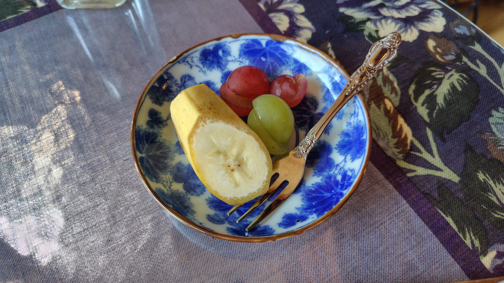 小さなフルーツの皿も出てきた。+200円でコーヒーがポットごと提供された。