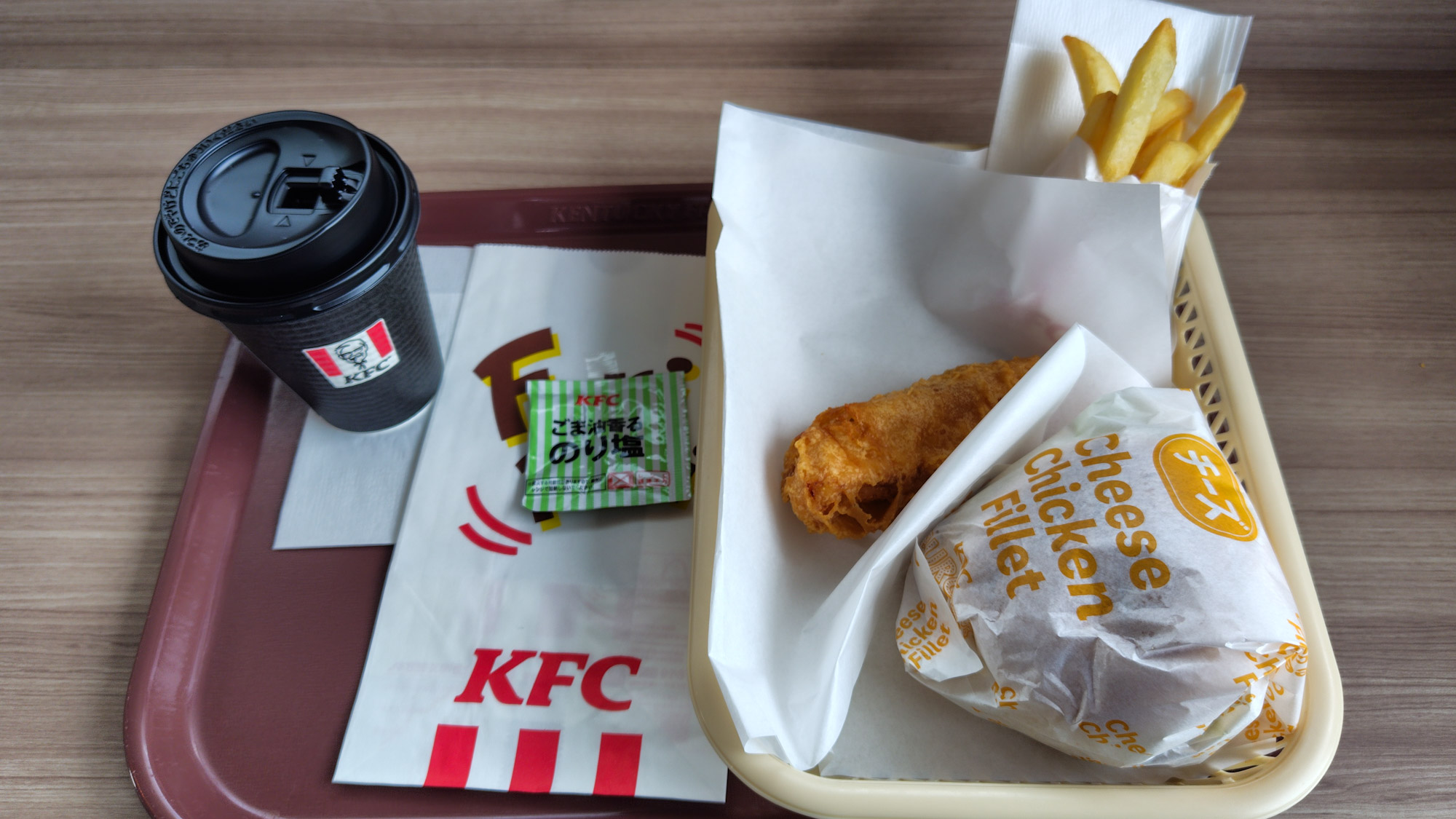 昨日の昼は、昼休みも仕事をしてたので、ランチタイムギリギリでケンタへ滑り込み。チーズチキンバーガーセット720円に限定のフリフリクリスピー(ごま味香るのり塩)320円。