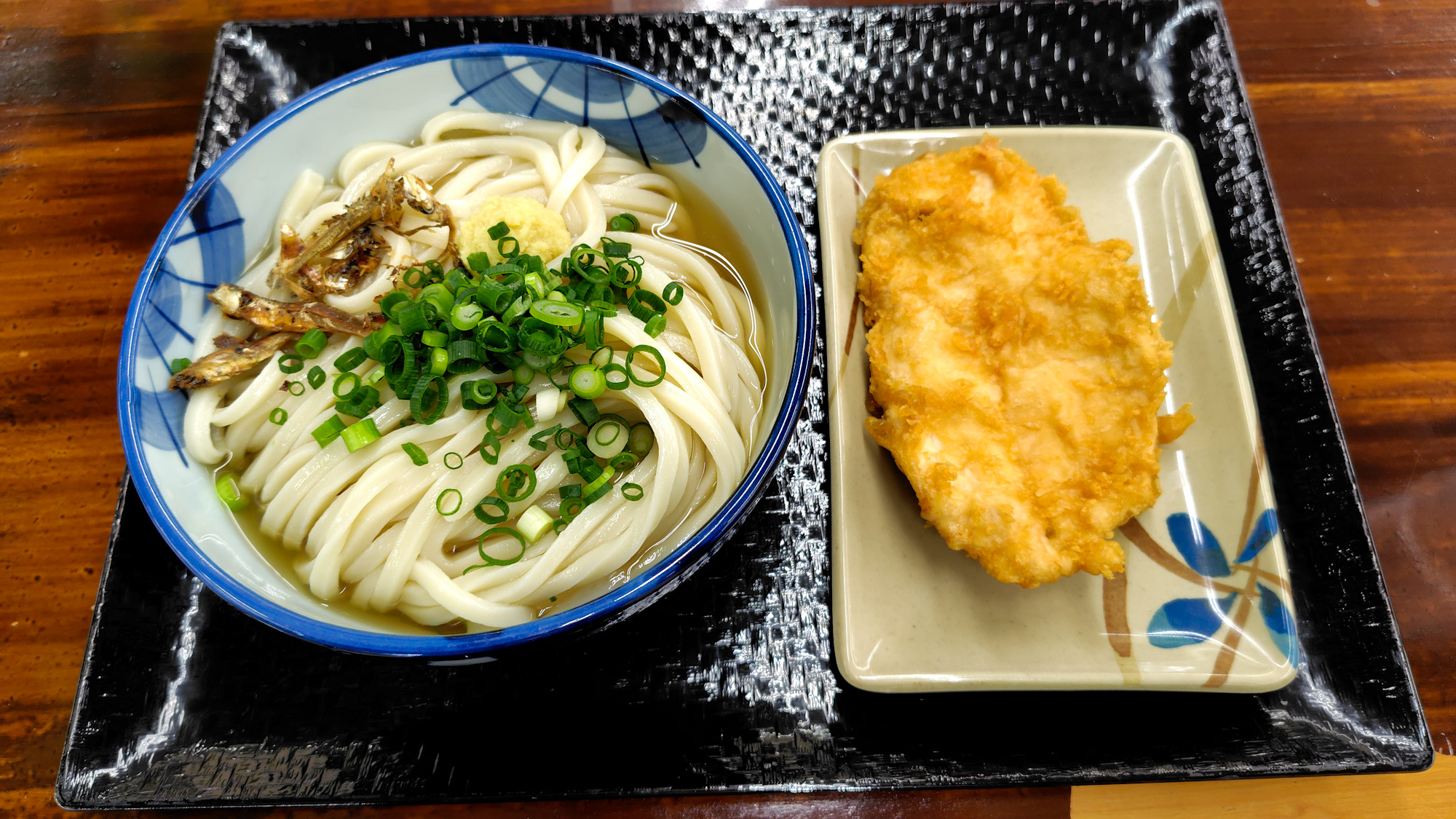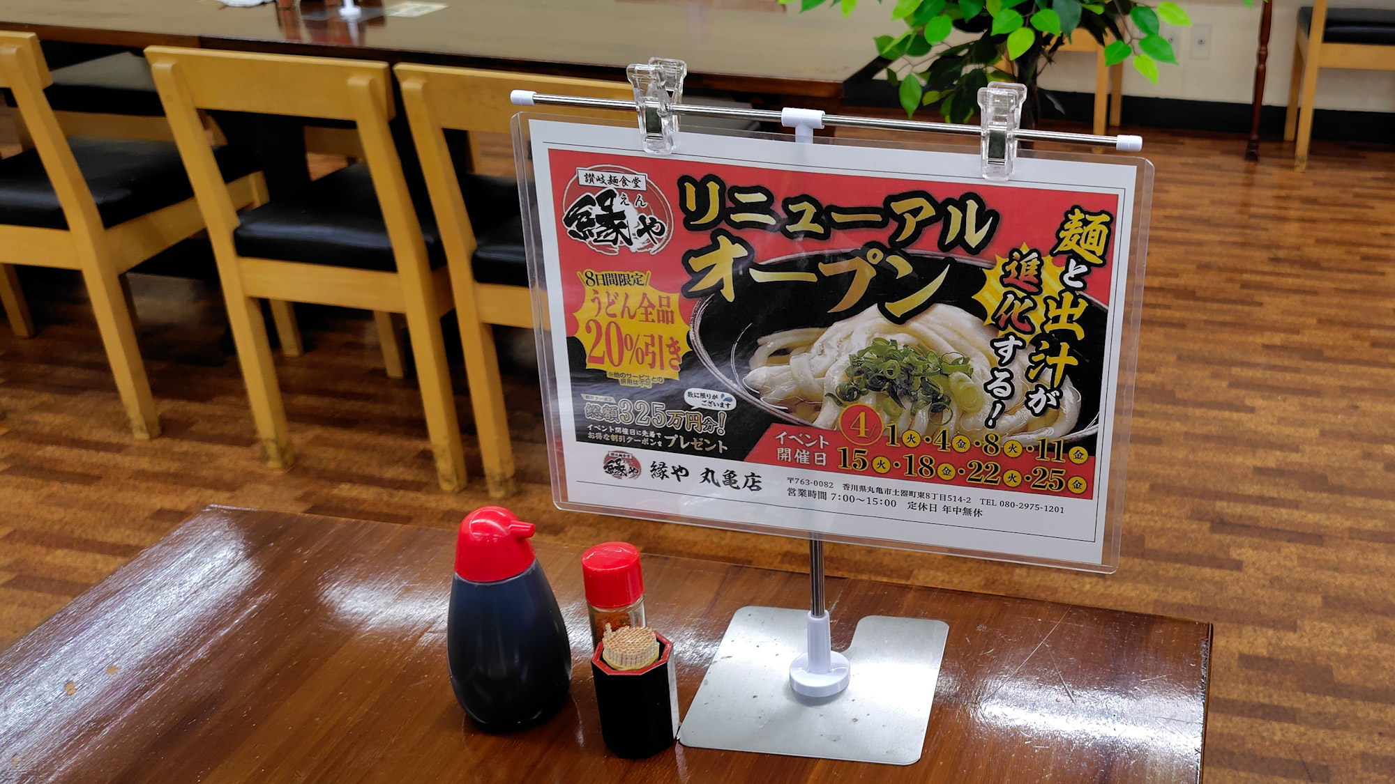 昨日の昼は丸亀市のセルフのうどん縁や。リニューアルオープンとのことでうどんが20%引きになる。かけ中430円が86円引き。