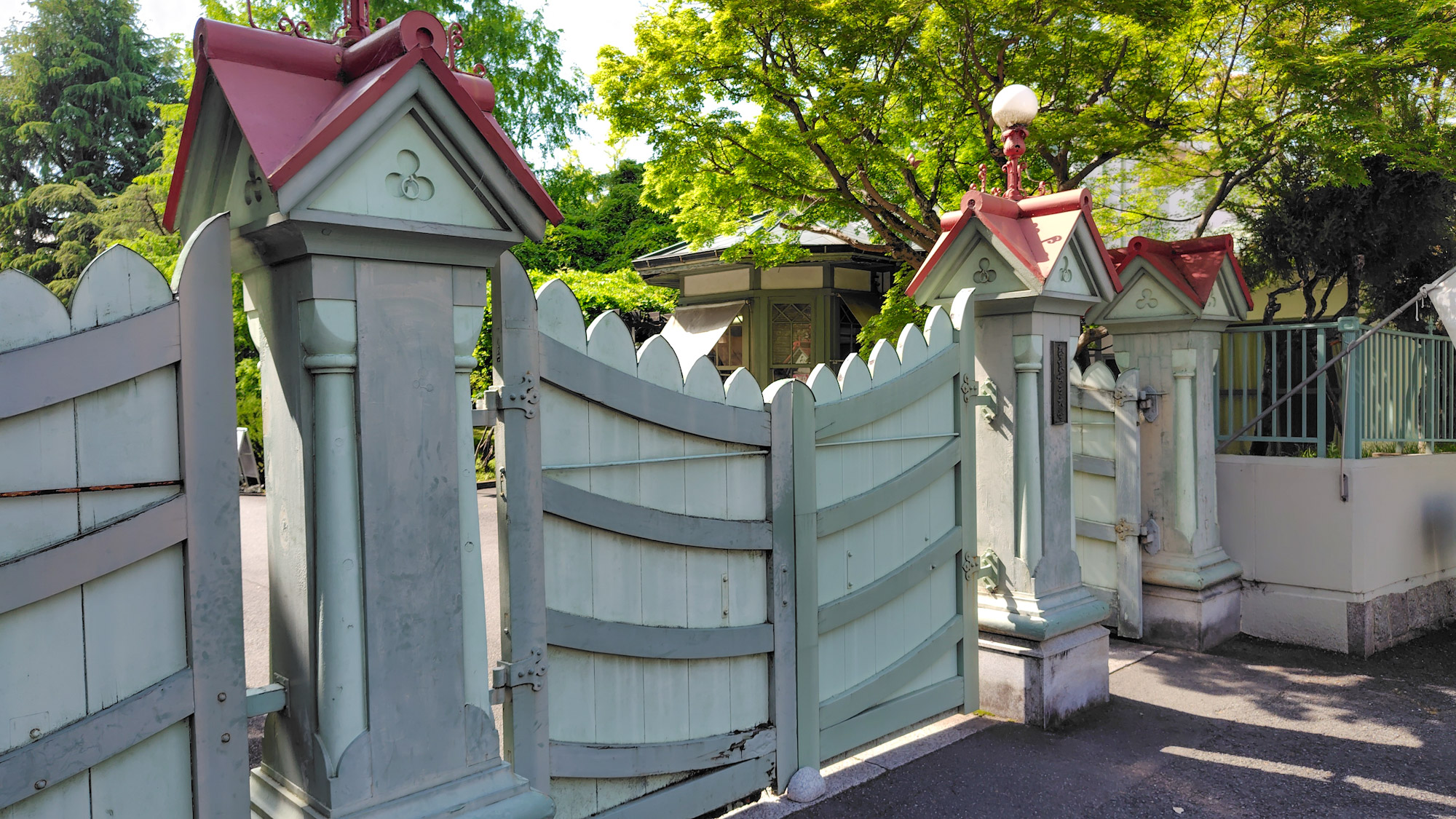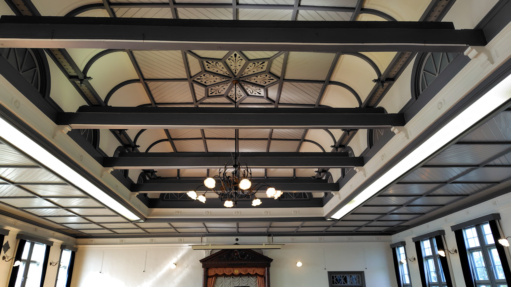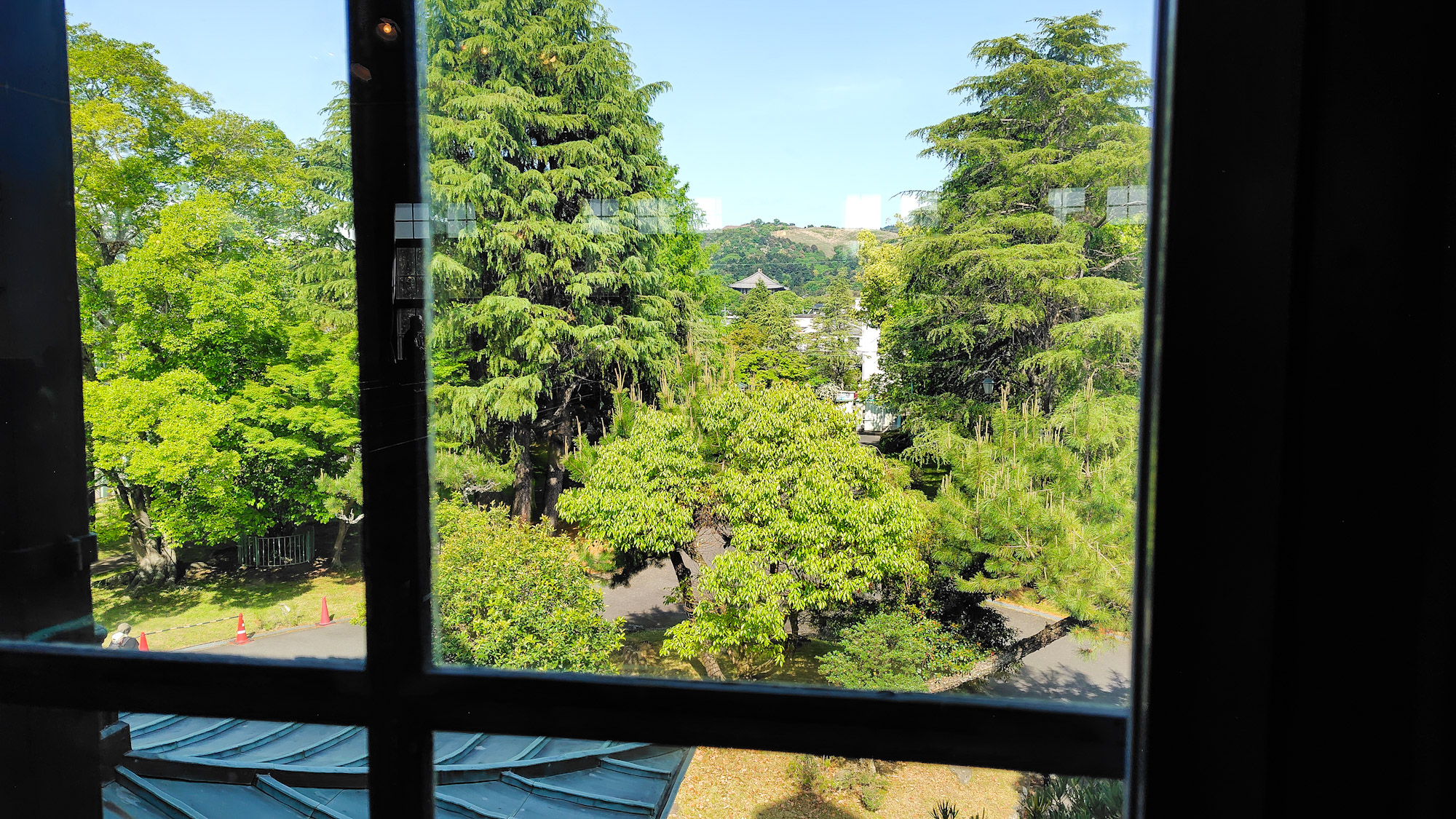 1階が事務室、2階が講堂として使用されてた。 柱や梁の木組みを外観に表す西洋風のハーフティンバー様式。 2階の窓からは遠くに大仏殿が見える。