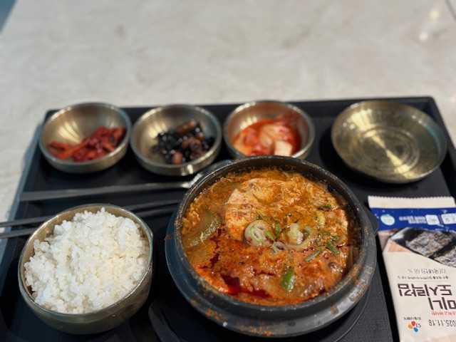 朝、うどんを食べた後、どうしても辛いものが食べたくなって、満腹に近かったですが、スンドゥブチゲを食べました。