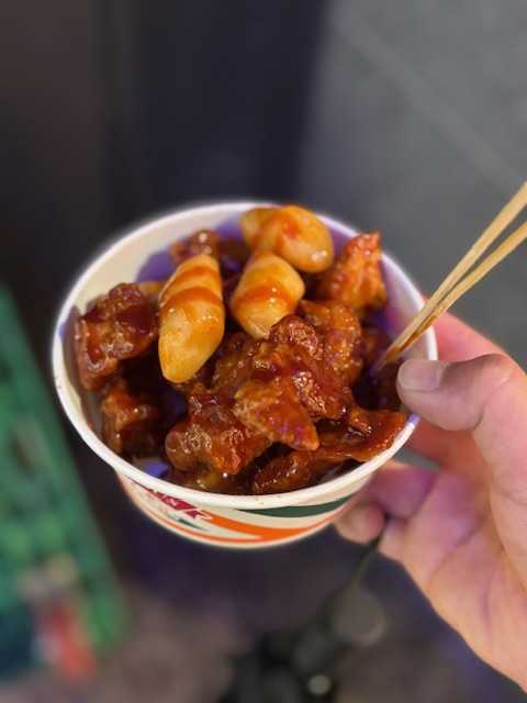韓国で、私はチキンが食べたくて、ヤンニョムチキンを買いました。トッポギ入りです。