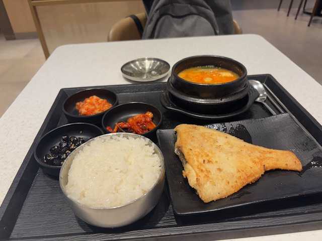 仁川国際空港の第 1 ターミナルの地下一階のフードコートで焼きカレイ?の定食を食べました。
