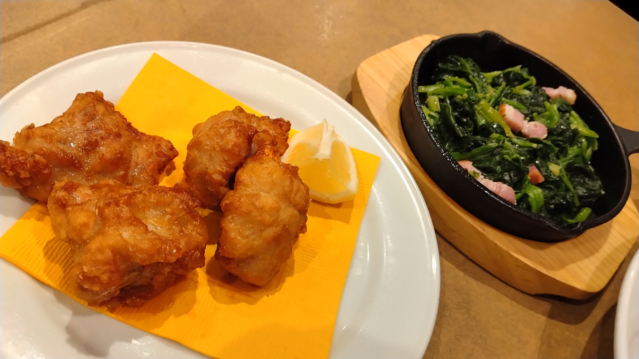 鶏の唐揚げ、ほうれん草とベーコンのバターソテー