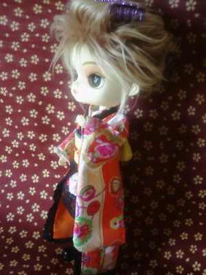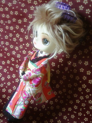 昨日の日記でkooが着ていたのは、元々はジェニーの着物。愛ちゃんの着物と一緒に購入したものですが、Kooには大き過ぎ^^;Kooサイズにするか!ってことで、一旦全部ほどいて裁断しなおし縫製・・・ってもしかして、一から作ったほうが早かった???( ̄ー ̄; ヒヤリお!余りでミニスカート作れる!!普通にサイズ直しするだけの予定でしたが、着物バージョンと和風ワンピにできる!と思い、急遽二部式にしてみました^^こちらがそのお着物スタイル。腰紐一体型?なので、紐をぎゅーーっと閉めてギャザーを寄せ、その下にミニバージョンを着せたのが昨日のKooちゃんですwちなみに昨日の2枚目がミニスカバージョンに、しても・・・さすがは既製品・簡易バージョンw衽もなければ、縫い代いっぱいいっぱいの状態でミシンでガガガーーーwww初めは袷にする予定だったので、まずは袖を・・・(^・ω・^).....ンニュニュ?シャリ感のあるしっかりしたプリント生地、裏をつけた時点でまるで板のようにがっしり^^;;あきらめて裏をはずしました・・・そんなこんなで私のドール初着物体験は終わりましたぁうむ・・・やはり、一から仕立てたほうが早かったか???(ノω`*)おまけショット!!w 初公開!!Kooのうなじ~♪ツンツクツンのKooの髪は、クリップだらけになりながら、無理やりアップスタイルにされていたのでしたww