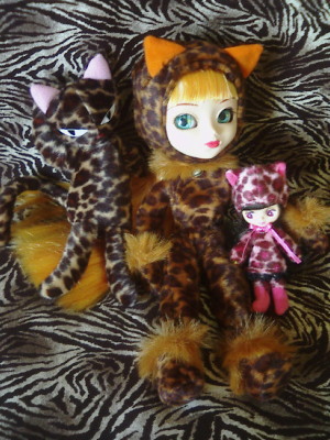 ハードボイルド作家・門田泰明先生の代表作「特命武装検事・黒木豹介」通称「黒豹シリーズ」第19弾の「黒豹ラッシュダンシング(全7巻)」検事でありながら武装を許され「ベレッタ・ダブルアクション25」なる拳銃を携帯。日本はおろか世界・宇宙、更には過去にまで飛んで地球の平和を守る黒木豹介の活躍を描いた人気シリーズ。●●戦隊とかのヒーローものか??と思ってしまうような設定wwでも、中身はいたって本格ハードボイルドです。「黒豹ラッシュダンシング」では、ヨーロッパ、アメリカ、アジアと要人暗殺が世界規模へと拡大し緊迫する世界情勢のなか、凶悪テロ組織に立ち向かう黒木の活躍を描いています。では、この辺で・・・本題へ参りましょう~wwジャジャーーーン!!!BDプレゼント第3弾の「Mitzi」ちゃんです^^(背景の生地選び失敗で、付属の豹がボケボケ&ブラ子が浮いてます;;)ムーンちゃんとペアでオク出しされていたので、見逃す手はありません!!w新品未開封の子だったので、状態もなかなか良く、心配していた色移りもありませんでした^^ただやはり、ボディの劣化はしかたないですね・・・;ムーンほどではないですが、手首の関節が弱ってて、いじるとぽろっと・・・( ̄ー ̄; ミツィちゃんもボディチェンジするかな。ちなみにムーンとミツィちゃんは、すでに名前が決まっています♪ムーン=美夜(みや)、ミツィ=姫夜(ひよ)です。猫→みゃぁ→みや、豹→ひょう→ひよ・・・ダジャレですが;;お迎えするずーーーっと以前から考えていた名前だったりします( ̄m ̄〃)ぷぷっ!追記w二人の名前にちなんで?おおかみさんの名前も決定しました!!李夜(りーや)くんです(*゚▽゚ノノ゙☆パチパチわかる人はわかると思いますが・・・「赤ずきんチャチャ」のリーヤくんからいただきましたw