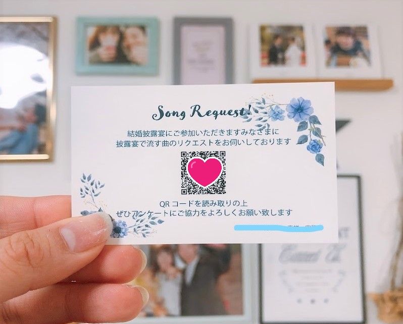 前回招待状について書きましたが、「HAPPY LEAF」さんで頼んだ招待状の他に、一つ自分で追加してこちらを付けました!「ソングリクエスト」です!!結婚式のテーマの一つが「歌」だった私たちは、ぜひ参列してもらうみなさんにも歌を楽しんでもらいたいということで曲のリクエストを招待状と一緒にしてみました!リクエストの取り方については、はがきに書いてもらえるようにするのか、別途でなにか送るのか等々迷ったのですが、結局インターネットで簡単にアンケートが取れる「Google フォーム」を使うことにしました♥その名のとおりGoogleが無料で提供しているサービスなので、Gmailのアカウントさえあれば作成も利用も無料ですることができます!!早速「Google フォーム」でアンケートを作成する方法を紹介しますね♪まず空白で新しいアンケートを作ります作成を始めるとこんな画面が出てきますまずはアンケートの名前を変えて、説明文を追加します。私は「Song Request!」という題名にしました♪説明文に関しては画像内を参考にしてみてください!次にアンケートをどんな形式でとるのかを選びます!私はここで「段落」を選択しました♪次に質問内容を入力します!たくさんリクエストが欲しかったので画像のような記述で募集しました♪私はリクエストしてくれた方にお礼がしたかったのでここでもう一つ「記述式」の質問を追加して名前を聞くことにしました。質問の追加は右側のプラスボタンですることができます!ちなみにデザインをかわいくすることもできます♡右上のパレットアイコンをクリックすると、好きな色を付けたりできるようになります😊ちなみにちなみに画像を選択とすると、テンプレートから画像を選択できます♪私はウェディングのジャンルから画像を選択して…こんな感じのデザインに仕上げました!なんだかすごく長くなったので、次回、実際にカードへの印刷編を紹介します!w↓招待状についてはこちら招待状について↓ソングリクエストをするに至った結婚式のテーマについてはこちら結婚式のテーマについて♪(演出編)↓ランキング参加中♥応援していただけると励みになります♪
