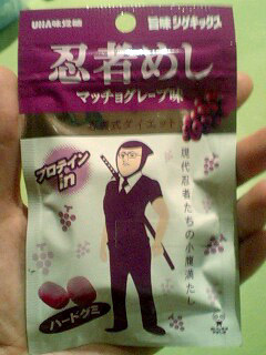 アホ菓子発見。ボケててすまんw品名からしてもう…wwwつか、なんのお菓子かさっぱりワカリマセンでしたが…グミです。グミでバカネーミング…といえば?!はい、以前ブログにも書いた「宇宙めし」です。UHA味覚糖です。さすがです。つかアホですか(褒めてる)。そしていちいちキャッチフレーズがイカス!・マッチョグレープ味・忍者式ダイエット・現代忍者たちの小腹満たし・プロテインin・ハードグミもうどこから突っ込んでいいやら…一番最後のしか理解できなさそうです。そしてこの顔。これが現代忍者か…納得です。そう思うと「マッチョグレープ」も「プロテイン」も理解できます。食べたら普通のグレープ味のハードグミです。プロテインが入ってる感じはよくワカリマセンでした。いや、わかるほどプロテインが入っていたら、それはもうグミじゃなく健康食品になっちゃうし。ちなみに、この忍者めし。他にも「ぴちぴちピーチ味」とか「闇夜のブルーベリー味」とかあるらしいです。私が見たのはこれと「梅かつお味」でした。ピーチ味は女性向けでしょうか?もしくは、くのいち好きな男性に向けて?ブルーベリーはなんとなく目に優しい。闇夜もバッチリ☆なフレーズが予想されます。…と思って詳細を調べたら…当たりすぎ。でも語尾が「ござる」は予想外。さすがです。ヤマザキナビスコも好きですが、UHA味覚糖も好きになりそうな昨今です。