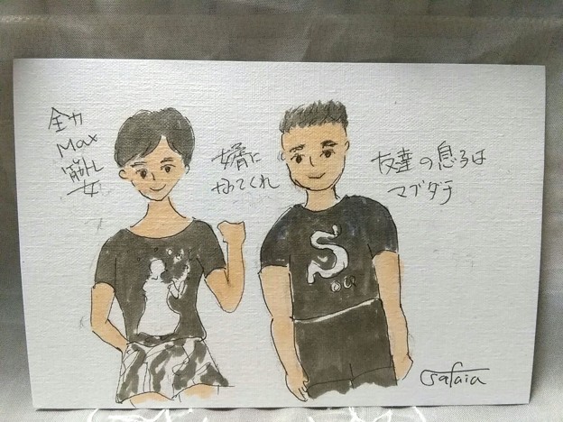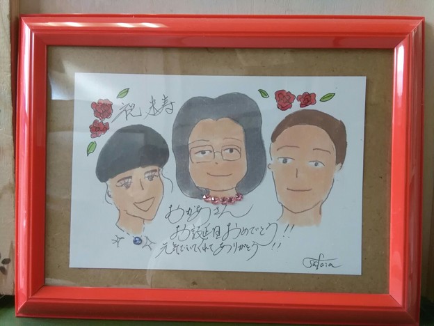 おはようございます♪ お忙しい中で訪問頂きどうも有難うございます。先週の水木と、インフルエンザで熱が出て、一時は意識不明になりましたが、その後は順調に熱が下がり、月曜日からジムにも復帰しました。たった、5日程度運動をしなかっただけなのに、かなり体力が低下しているのを感じました。体重がキロ半ぐらい落ちて、ちょっとやつれ感が…咳が少し残っていて、体調もまだ万全ではないので、以前のように早寝を徹底しています。というか、久しぶりにジムで体を動かしたところ、疲れて起きていられないのです。昨日も9時前にバタンキューでした。 願いが叶うまで56 元気のスイッチを押してくれる人 posted by (C)みえこ55母の介護が始まったのは一昨年の12月のこと。何もかもが初めてで、戸惑うことばかり。介護サービスを受けるための認定方法や、どんなサービスが使えるのか、認知症の人の介護の仕方、引っ越しに伴う様々な手続き、何も知らないことばかり。そんなときに、ジムでレッスンを待っている間に、私も家で旦那のお母さんの面倒を看ているという友達に出会い、それまではあまり話をしたことがなかったのですが、以来介護の大変さを語り合ったり、アドバイスをもらったりしているうちに、とても仲良くなり、多向こうもそう思っているかどうかはわからないですが、私は親友だと思うようにもなりました。彼女と話をするまでは、何十年も義理のお母様の世話をしてきた人だとは知りませんでした。いつも明るく元気で疲れた感じの所を一度も見たことがなかったからです。しかし、話を聞くと、義理のお母様は足が悪く、家の事などはいっさいやらないとのこと。朝食事の用意をして、お茶などを飲めるようお湯なども沸かし、テーブルにセットして出掛けてきたり、お母さんがデイサービスのある日は、シャワーも浴びずに家に急ぎます。ある日、私が母を病院に連れていった時のこと、偶然彼女とお母様に出会ったことがありました。互いに車イスをひいて親を連れて来ていました。歩けない人の外出をサポートするのは本当に大変なことで、それを何年も続けて来た彼女はすごいなと思ったのを思い出します。先日そのお母様が今年米寿なので、お祝いをしてあげるのだという話をしていたので、それなら絵を描いてあげるからお母様の写真をスマホで送ってちょうだいと言ったのですが、彼女から写真がなかなか送られてきませんでした。インフルエンザでジムを休んで、やっと彼女にまたジムで再会したときに、これがお義母さんだよと、スマホで写真を見せてくれたのですが、やはり送ってこないので、次にあったときには送ってといわなければと思っていたとき、なんとなく、彼女が病み上がりの私に写真を送っていいものか、きっと遠慮しているのだろうと思い、そうだ、記憶にある残像でどれくらい描けるものなのか?自分でも試してみたくなり、描いてみたのがこのイラストでした。旦那様もジムに来ていて、会ったのは3回ほど。話もしたことはなく、ちらっと見かけた程度でした。不思議な事に、自分でいうのも変ですが、かなり似ていると思います。昔から記憶力には相当自信がなかった私なので、たった一回か2回目会った、それも数秒間見ただけの人を、ここまで記憶できるということが、自分でも不思議です。早速昨日、彼女に渡して来たのですが、やはり、病み上がりの私に頼むのはまだ早いと思って写真を送るかどうか躊躇していたと言っていました。大層喜んでくれて、特に義母さんの部屋には、自分と旦那様以外の、旦那様のご兄弟との家族写真は飾られているけれど、自分達との写真は一枚も飾られていないのだと言って、とても喜んでくれました。元気でいてくれて有難うなどと、言えないほど日々大変なのはわかっていましたが、あえてこんな言葉を、彼女になりかわって、書き入れました。すると、彼女は、それを見て、そうだよね、お義母さんが元気だから、私もここ(ジム)に来れるのだよね。と笑顔で言ってくれました。彼女に出会わなければ、私はジムに行かなくなっていたかもしれないと、そう思う出来事が以前ありました。介護が辛すぎて、体を動かす気力が途絶えそうになったときがあったのです。もう家に帰って、しばらく休もうと思ったときに、彼女が次のレッスンに行よ、早くおいで。(一緒に行こう!)その一言で、何かのスイッチが入ったのでした。あのときのお礼、まだしていないのですが、まずはこの絵を先にプレゼントした次第です。元気がなくなって、やる気も失って、気分が急降下しているとき、元気になる、やる気が出てくるスイッチがあります。自分で押すこともありますが、ふとした瞬間に誰かに押されることがあって、自分でも驚くほど、その瞬間から背筋に何かが走って生気がよみがえってくる。ということがあります。これが、とても不思議で面白い現象だなと思います。私も、絵やダンスを通して、誰か