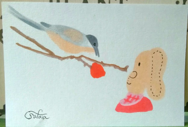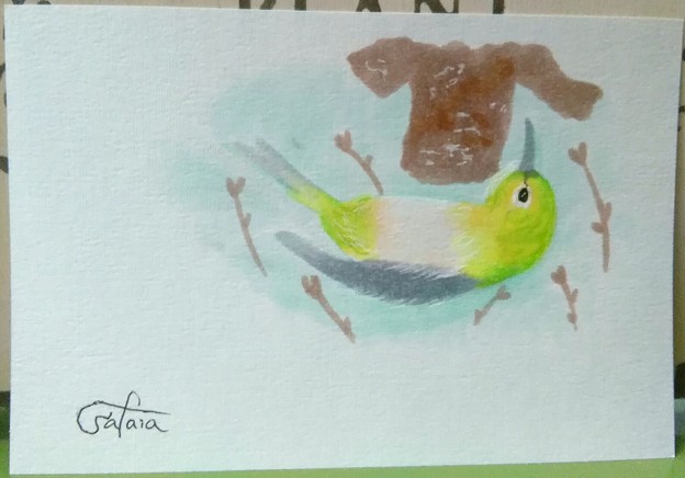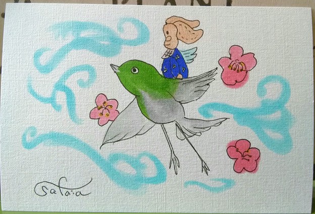 おはようございます♪お忙しい中で訪問頂きどうも有難うございます。昨日はとても暖かくて、外を歩くときにコートだけでなく、暑くてカーディガンも要りませんでした。そこらじゅうの花が一気に開花して、垂れ梅など、とても綺麗に咲いていました。今日も朝から8度以上もあって暖かいです。スタッドレスタイヤ、全く活躍することがありませんでした。いつ外そうかな?夢が叶うまで157 あるものとないものを描く posted by (C)みえこ55色々な描き方を自分なりの方法で描いています。最近は、そこにあるものと、実際ないものを組み合わせて描くということに取り組んでいます。絵の基本的な技術を鍛えながら、同時に創造力を働かせるという課題です。今朝はnabegoro さんのメジロを描かせていただいただきました。ささっと描いた走り描きのようなものですが、ここからまた次に繋がって行くと思います。原案のようなものです。ひまうさぎさんがメジロさんの背に乗って、大空に飛び立ちました。気がつくとひまうさぎさんの背中にも小さな羽が出来ていました。飛び立とうと言う気持ちから生まれてきたのでした。nabegoro さん、素敵なショットを本当に有り難うございました。 http://photozou.jp/photo/show/270901/260380536夢が叶うまで158 夢は叶っているものだ posted by (C)みえこ55絵を仕事にしていこうと考えてから、私は恥も外聞もなくこの場を借りて、「夢が叶うまで」などというエッセーらしきものを書きはじめました。その理由の一つには、沢山の人の前で公言することによって、逃げ場をなるべく作らないようにするためという理由があります。自分を追い込んでモチベーションを維持し続けるのです。皆さんはどうか知りませんが、私の場合は無意識に過ごしていると、「今日はまあいいか…」とか、「別に趣味でやっているからこんなもんで十分だろう。」などと考え始め、やがてやめてしまったり。そんな事態になる可能性があると思うのです。若かった頃にはそのことに気づかなくて、途中であきらめてしまったとがあり、あのときやめずに食らいついていればなと思ったことがいくつあります。そのいくつかは、途中でやめたというよりも中断したと言ったほうがいいかもしれません。無意識にあきらめて投げ出したかと自分で思っていましたが、若かりし日に抱いた夢はほぼ実現したり実現に向かって取り組んでいます。その中の二つはダンスと絵でした。いつか外国に住もうとか、そういう夢は実現しましたが、ダンスと絵に関しては、何をもって実現したとするかによって、違ってきますね。それらに取り組んでいるということだけでも半分は夢が叶っています。あと半分はこれで生活が成り立つかどうかというところだと思います。よく人に言われるのが「旦那さんが働いているのだから生活には困っていないのでしょう?なのになぜ仕事にするのか?」と。それは、多分子供の頃からの夢で自立した生活が送りたいとう夢があったからだと思います。今の状況はとても自立しているとは言えないです。自立ってすごいなと思うのです。それが一番難しい、最後の挑戦かもしれません。母が認知症になる前は、「あんたたちの世話になどならない。」というのが口癖でした。しかし、実際はそうではありませんでした。最後の最後まで自分のことを自分で出来るのか?こればかりは努力だけでは難しいです。しかし、できる限りのことはしていこうと思います。認知症は生活習慣病です。母は看護師を長年してきましたが、その事は知りませんでした。脳を鍛えることを意識して生活はしてこなかったのです。好きなものを好きなだけ食べ、運動は嫌い。動くことは嫌いだったのです。なるべくしてなったなと私は思いました。母と暮らした8ヶ月で、私は確信とまではいかないかもしれませんが、日々の習慣が認知症につながったのだと。そう考えました。それは食べることや寝ること、運動習慣のほかに、頭をどう使うか?ということも重要だと思いました。母が何をどう感じてどう行動するのか?このことがよりはっきりとわかったことは、私にとって人生がひっくり返るほど大きな発見でした。母の世話をするのはとても大変だったのですが、おかげで、自分の後半の人生をどう生きるかを考える、とてもいい機会になりました。ぼんやりしていた行き先がだんだん見えてきたのです。弱音ばかり吐いていた事もありましたが、そんな暇があったら絵を一枚描くか、ダンスを一曲踊らねばと思います。すごく思うのですが、子供の頃から抱いていた夢は、途中で忘れかけたりしていたものもありますが、強く思ったかどうかわからないですが、それでも自分のどこかにあって、そこに向かっていたと思います。なので、夢と言うものは叶い続けるものなのだと思います。いつもうざいほど長いキャプションにお付き合い下さって本当に有り難うございます。夢が叶うまで159 絵には魂が宿る posted by (C)みえこ55絵を描