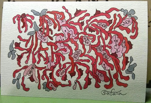 おはようございます♪お忙しい中で訪問頂きどうも有難うございます。夢が叶うまで44 夢で見た少女 posted by (C)みえこ55昨日は、明け方不思議な夢を見てめが覚めました。真っ赤な藁で出来た服を着た少女の絵の夢です。多分絵だったと思います。私が最近好んで色を使っている赤色をしていました。赤といっても色々な赤があり、この赤は単色では出せない赤です。4~5種類の色を何度も重ねて作っていきます。一見、見た目はただ一色を塗ったようにしか見えないかもしれませんが。まだこれでも浅い色だなと思うので、これから更に色を塗り重ねていく予定です。夢で見た少女は子供の頃の私のようでもありました。雪におおわれて、グレーと白けのモノトーンの世界で私は幼少期を過ごしていました。この赤は多分ですが、子供に頃に母が編んでくれた手袋の色のような気がします。母が機械編みで作ってくれた手袋。とても嬉しかった記憶の色なのだと、そう思いました。子供の頃「みえこは赤が似合う」と言って、母は私に赤い服ばかりを着せていました。ちょっとハイカラなお金持ちの友達が黒いワンピースを着てるのを見て、私も黒が着たいのにと思っていましたが、一度も着ることはなかったと思います。しかし、今になって、なぜか赤が好きでたまらなくなっていて、この赤に対する想いは何なのか?と、自分でも不思議に思っていたのですが、もしかしたら、子供の頃から親に刷り込まれてきた赤が沸々と自分の中で勝手に成長しはじめているのかもしれないと思ったりしています。夢が叶うまで45 介護される体験 posted by (C)みえこ55今朝夢で見たイラストの女の子は、赤い藁の服を着たゆきんこのような女の子でした。夢の中で見た女の子のイラストを忠実に描いたものを息子に見せたら、怖いと言われたので、現代風にモヘヤのついたドレスに変えてみました。それでも、やや怖いか?さて水曜日、木曜日とインフルエンザで熱を出し、金曜日の朝には熱が下がったのですが、土曜日の今日の時点ではまだ頭がぼんやり、何もする気が起きないような体調の悪さです。しかし、絵くらいは描けるなという感じではありまして、朝から寝たり起きたりというか、寝たり描いたりという一日を過ごしておりました。熱が出て2日目の朝、医者に処方された新薬のゾフルーザを飲みましたが、熱が上がる一方で、あまりにもきつかったので、夕方になって同じく処方された解熱剤ロキソプロフェンNa錠を飲んだ直後、私は、寝室である2階に向かう途中で倒れて意識がなくなりました。この時にたまたま大学一年の息子が家にいたので、なんとか介抱してもらい事なきを得ることが出来ました。その後も病院に連れていってくれたり、夜中に経口補水液を枕元に置いていてくれたり、部屋の温度が低いと言いながら、エアコンを入れてくれるなど、かなり献身的な介護をしてくれました。一方で長女と夫に関してはほぼノータッチ、長女にいたっては、うつされたらたまらんということで、極力の接触を避けられています。仕事がありますから致し方ないですが。母を介護が始まったときもそうでしたが、夫と長女はノータッチの我関せずスタイル、長男が多少頼んだことはやってくれる時もあったという状況だったのですが、まさに自分が介護される時も同じ状況になるにだということがシュミレート出来ました。食事やその後片付けくらいはやっていましたが、掃除は全くで、掃除が出来なかったのはたった3日間だけでしたが、部屋はほこりだらけになり、あちこちにものが散乱したままになりました。昨日はpはそれらをなんとか片付けて、久しぶりに元気だった頃の部屋に戻すことが出来ました。体調が悪くなったときのサポート体制を今後は考えなければいけないのだなあとは思いましたが、具体的に何をどう準備すればいいのかわかりません。今回最も助かったのは近所に住んでいる奥様達が食事を届けてくれたことでした。栄養を考えたおじやなどを届けてもらったり、私の大好物のお菓子をポストに入れてくださったり、これで命がつながれたなとさえ思ったほどでした。最もあてにならなかったのは夫でした。昔からマイペースで自分の事しか考えないところがありましたが、相変わらずというか、更に最強になっている感じです。そんな夫ですが悪いことばかりではなく、私にほぼ関心がないかわりに、私がやることにいちいち何も言わないという利点があります。この最大の利点を生かして、私はダンスを続け、絵を描き続ける事が出来ているとうわけなので、まあよしとせねばなりません。また、具体的に細かく指示をする形でお願いをすればやってくれることもあるので、ここはお願いをするやり方を工夫してお願いをしていくしかないです。夢が叶うまで47 ご縁を大切に posted by (C)みえこ55今回絵を描きはじめて、単なる趣味で続けていくつもりだったのですが、仕事にしたらどうかと言ってくださった方