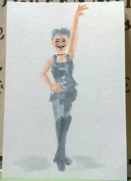 おはようございます♪お忙しい中で訪問頂きどうも有難うございます。今日は朝からよく晴れていますが、相変わらず寒いです。昨日は夢を見ていました。ダンスをやりながら、休憩時間にも絵を描いている夢でした。とうとう夢の中でも絵を描き、ダンスの練習をするようになってしまいました。夢が叶うまで27 舞姫2 昨年末に行われたダンスの発表会。さくらふぶきさんから撮っていただいた写真を絵にしました。同じ写真で一度描いていますが、うまく描けなかったので再度チャレンジです。初めて描いたとき以上に難しく感じました。何でかけないのだろうと思うほど。顔は全く似ていません。笑顔や雰囲気は近づいては来たのですが。またチャレンジしたいです。夢が叶うまで128 好きな事を仕事にする posted by (C)みえこ55子供の頃から体を動かす事が好きで、自分でもその自覚はありました。特に父親転勤で岩手に住んでいた頃は、裏が山だったし、海も近く、山や木に登ったり、海も兄と二人で行っていたので、今思うと私はよく生きていられたなと思うほど危険な事をやっていて、もし、自分の子供がそれをやうとしたら、真っ青になって止めたと思うような、そんなことばかりをしていました。そうして、野放しで野生化し大人になった今、一番好きな事はダンスで、同じくらい好きなのが絵であることがわかりました。それと、もうひとつ好きなことは書く事です。これも物心ついた頃から好きで、記憶では小学3年の頃だったと思いますが、日記を書きはじめ、それは今でも続いている習慣です。今は、寝たり家事をしたりする以外の、自分が持っている時間の全てをこの3つに使っています。さて、昨日は舞姫というタイトルでこちらの絵をアップしました。さくらふぶきさんが撮って下さいました。いつか笑顔を沢山の人に届けたいという夢があり、それを仕事にしたいと思っています。笑顔を届ける仕事って何?と思われるかもしれませんが、その方法のひとつひとつが、子供の頃から自分が好きだったことです。ダンスであり絵であり書くことです。限られた人生を少しでも笑顔で過ごしたいと、私自身思っています。しかし、現実は辛いこともあります。泣きたくなるようなこともあります。しかし、どんなときも笑顔が自分を支えてくれたと思います。私が好きでやってきた事の中で、唯一仕事として成立したものは、運動指導でした。体育の道に進み、この道だけは途中細い道になったこともありましたが、一本の道になっていると思います。ダンスや絵を描くことは一見別の道のように思えるかもしれませんが、私からすれば、やってきた事の延長にすぎないのです。絵を描くことは細かく指を動かすひとつの運動です。ダンスを習得するためには、手本となる先生の動きをよく観察して真似ることが基本の練習です。絵も全く同じで、見てそれを指先で再現するという運動なのです。長年運動生理学とコーチ学等を学んできましたが、その知識はどんなことに取り組む場合も役に立つと実感しています。さて、毎日色々な絵を描いていますが、必ず複製しています。原画の方がいい場合と、複製の方がいい場合、複製にするとダメな場合があります。また複製にしてもマットな仕上がりがいいのか?光沢があった方がいいのか?やってみないとわかりません。なので、気に入った作品は、お金がかかりますが業者に出して印刷をしています。こちらは、中央が原画で向かって左がモノクロ、右がカラーです。舞姫は複製でもいける作品だと思うので、今後力を入れて描きたいです。こちらのポーズは一見簡単そうに見えますが、激しい動きをした直後に一発でぐらつかないで決める必要があります。なので、かなり難易度が高いです。また、激しい動きをした後でなくても普通の人は出来ないポーズです。真面目に取り組んでも一生出来ない人は出来ないポーズなのです。ぜひ皆さんも鏡に向かってやってみてください。 ←ポチっとお願いいたします♪