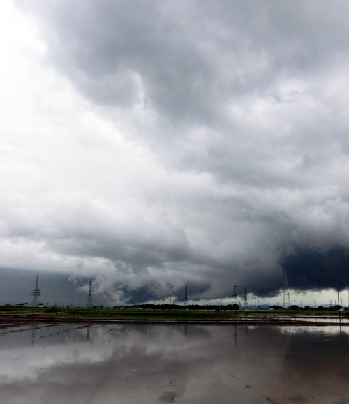 ものすご~く感じ悪い空模様だこと(^^; 何ていうか不吉な…ふと通りかかった別府沼公園近く、見晴らしが良いぶんお空の邪悪さ全開!台風接近の影響で、1日は熊谷近辺も何度かゲリラ的に降ったよね~。ニュースでは、深谷と本庄で床下浸水が出たとか、伊勢崎がすごい事になってたりとかまだ台風は遠いけど、何だか1日じゅう、思い出したように雷が鳴るよ…まさに今も。1日は午後ちょっと用事で出掛けて、その間はたいした事なかったんだけど公園の辺りでふと北の空を見たら、邪悪な空模様になっててビックリ(^^;巨大な水たまりと化した畑に映って、ますます感じわるっ!あの黒いとこはどの辺りかな、太田?すぐそこの用水路も、かなり増水してたよ。この後ちょっとだけ深谷市に入って、マニアックな田んぼ道を走っていたらわっ 道路に川が出来てる! 中洲まであるし(^^;いまのところの予報だと、台風は3日に西日本を通り抜けるって事でこのへんは2日~3日がかなり降りそうな感じ。3日(土)は朝7時45分頃~ちょこっとだけ、妻沼にNHK 「おはよう日本」 の生中継が入るって聞いてたけど、こりゃ中止かも? NHKの事は、先日たまたま久々に関根商店さん (以前掲載。営業時間その他詳細は 「めぬま縦横無尽。」 参照) にコロッケ買いに行って、聞いたんだ。関根さんもちょろっとご出演予定らしいんだけどね…どうなか~。