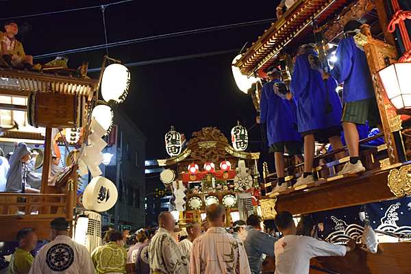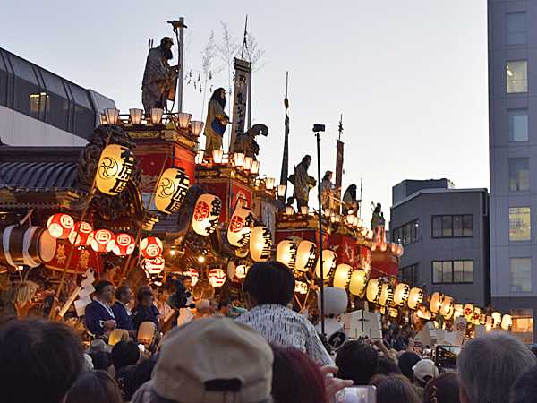 巡行祭後もずっと付いていけば、こんなご褒美が待っているうちわ祭2日目は、夜も山車・屋台がお帰りモードになる頃まで拝見したよ。※引き続きコメント欄を閉鎖中です、申し訳ありません。ここまで、1日目で5記事・2日目も5記事体制…今年のうちわ祭ブログは、どうやら史上最多本数になりそう。その覚悟で居座ったんだもんね~2日目は、19時15分頃に大きな全体行事としての「巡行祭」が終わったあとも、山車・屋台はまだまだ動く。国道17号を西へ向かいながら、途中数か所で止まって叩き合い。ちょこっとだけ離脱し、すぐ戻った頃にはもう中家堂前(市役所入口交差点)に集ってますな~。6台ずつの向き合いかな。お祭り広場ではいつも、特設舞台で色々やってるけどこちらはカバーしきれません(^^;17号で止まっては進み、ちょこっと叩き合い…の繰り返し。これも好きなんだけど、この時間は敢えて写真は頑張らずぼ~っと眺めてお囃子に浸ることに。それもヨシ昨年は事情で、2日目夜の見物を諦めなきゃいけなかったので今宵はひたすら楽しむ!八木橋前に集い出したので、そろそろ激戦区に入り込もうか!八木橋をバックにした扇陣形、これも本当に楽しみな場面今更だけど、いつもよく12台がこんな綺麗な形に並ぶよね。が。祭り好きにはこの先もあそこも人気で、私も大好きな場所。鎌倉町商店街に次々と進入まして~鎌倉町のちいさな広場に、ぎゅっと集結!素人から見たら、12台も並ぶには狭い場所で付近は商店&住宅が密集し、すぐそこに大きなマンションもあるのでま~お囃子がよく反響しますこと!いい場所だ全町が集まるのはここまで。散りはじめたのは20時45分くらいかな。最後まで残ってお見送りをするのは、ホームの鎌倉区。しかしまだまだ終わらない。ここからは分かれていくつかの場所で小さく叩き合いが。こくみんデンキ&清の家の前とかドーンデンキ前とか(^^)そろそろ本拠地へお帰りモード。私は車を西のほうへ置いたので、本石&荒川の帰り道に少々お供して最後は石原区をお見送り。2日目は10時過ぎ~21時半近くまでずっと市街地にいて暑さに耐えられる限り、お祭りを追っかけたさ。そして3日目も同じような…というか、もっと激しい1日にするようちわ祭は、まだまだ続く!(明日中までに全部終わらせたい、あと5~6記事?出来るか?)●当サイトのお祭り・イベント写真は、お顔にモザイクを施しています。→説明コチラ●当サイトの内容はブログ・facebook等 「ご自身で責任を持つサイト」以外には一切の例外なく転載 (抜粋・要約含め) 及びリンクを厳禁いたします。