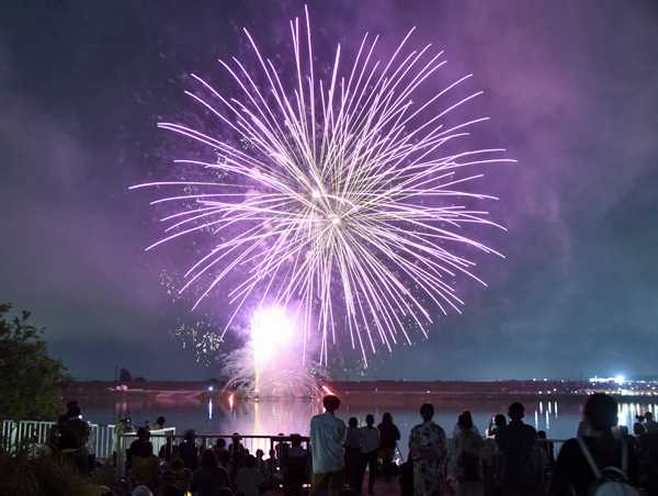 以前は千代田で見たので、今度は熊谷市側から…こちら側も最高!8月18日は「千代田の祭 川せがき」を拝見。11年ぶりにやっと行けて嬉しい※引き続きコメント欄を閉鎖中です、申し訳ありません。千代田町の花火は、毎年8月18日に利根川河川敷でとうろう流しも含めた「千代田の祭 川せがき」という行事で開催するのだよね。2014年に千代田側に行って、間近で見たよ。→2分割掲載…「その1」・「その2」7月から夏祭りが続くので、そうそう連日夜外出もしづらくてその時以来ぜんぜん行けてなかったけど、今年は久々に行くことに!今回は花火だけを対岸から拝見、ということにして20時ちょっと前に「葛和田の渡し」の乗り場あたりへ。対岸から見るのも気楽で良いね、そこそこ人は集まっているけどそんなにゴミゴミしておらず、河川敷駐車場も余裕で車を置けたよ。ギリギリ時間に着いたので、前のほうの良い場所はさすがに無理で川辺の柵から少し離れたところに陣取り。向こう岸は、テントやら多くの人やら…これ見ちゃうと、また向こう側も行きたくなる(^^;20時過ぎ、上がり始めたよ!じゅうぶん近いし、ちゃんと根っこから見えるのが嬉しい水面に映るのがすごく良いし、低い花火の火の粉が水面に落ちるところも、迫力ある~!序盤からテンション上がりまくり、今までここに来られなくて損してたよ。斜めに上がるやつもあり~巨大な線香花火みたいなのも、豪華高く上がるやつは、今のところギリギリ写真に入りきれる高さですかね…シャワーあり、ワイドなのもあり…バリエーション豊か。まだ慣れていない千代田花火、展開が読めなくてカメラがついていくの大変(^^;でもそれはそれで、また楽し。撮ったり直接見たり、はみ出したり小さすぎたり…をしばらくユルく楽しんで。お、右のほうからも上がってドッカンドッカン止まらねぇ~!クライマックスの密度の濃さよけっこうな時間、このレベルで上がり続けてうおおお~近い~ とてもカメラに入り切れねぇ~!!約40分間ということで、熊谷の花火より時間こそだいぶ短いけどそのぶん凝縮されていて見応えあり。そこそこ良い場所で見られたぶん、今回はぶっちゃけ熊谷より興奮したかも千代田町さんありがとう、私も今年からだいぶ自由になったので今度また千代田の行事も突っ込めたらと思います!あ、それと今年も11月1日(土)に「刀水橋花火大会」がありますな。どっち側で見ようかな(^^)帰りは、河川敷脱出にちと時間かかったかな(^^;●当サイトの内容はブログ・facebook等 「ご自身で責任を持つサイト」以外には 一切の例外なく転載 (抜粋・要約含め) 及びリンクを厳禁いたします。