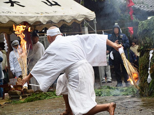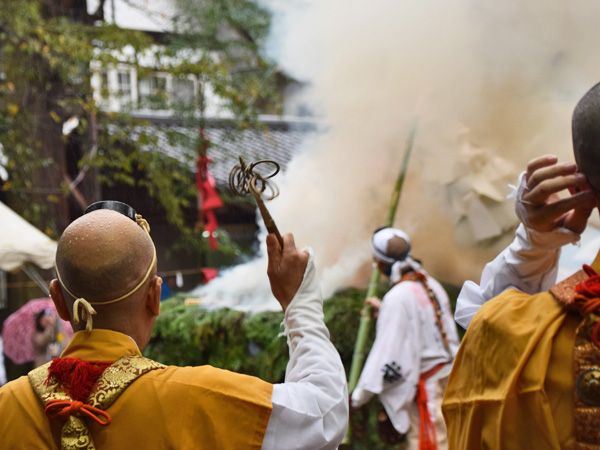 火をつけて振り回しながら護摩壇の周りをまわってる…何ですかこれは!?