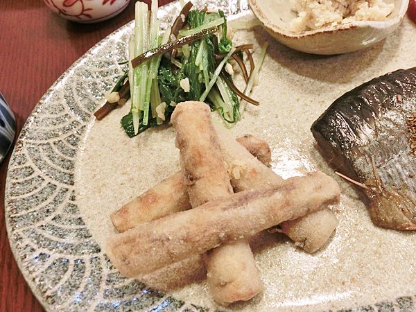 水菜のお浸しには、昆布とそばの実が入ってる。