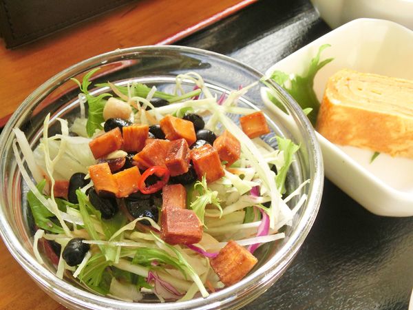 サラダには、カリッカリに揚げた角切りのサツマイモがトッピング。