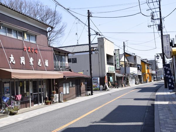 その先には、境内からも通り側からも買える和菓子の丸岡堂、お蕎麦の「みよし」。