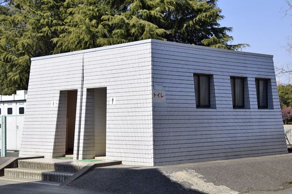 P入口の向かいのグラウンド内に、トイレが見えているけど、