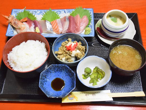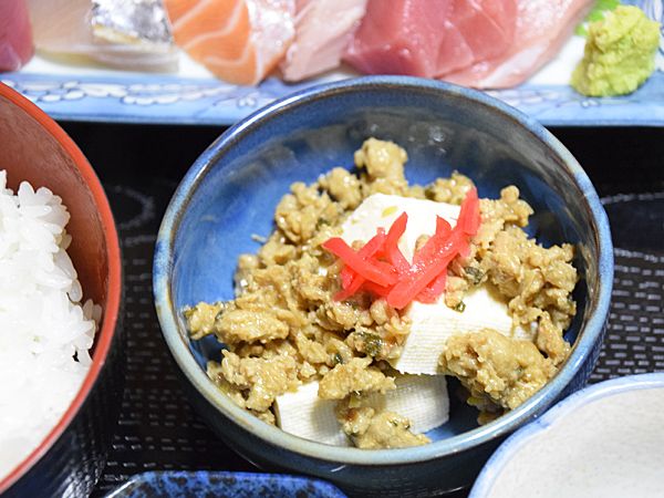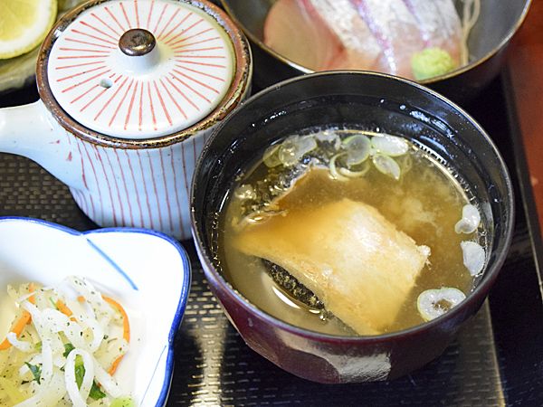 海鮮入り味噌汁・小鉢(このときは揚げ出し豆腐)・お新香・茶碗蒸し付き