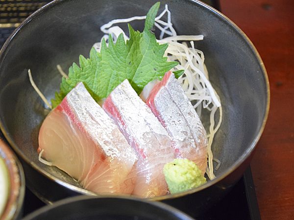 かんぱち刺身で生魚、あと味噌汁にもお魚入りで出汁が利きまくっていて