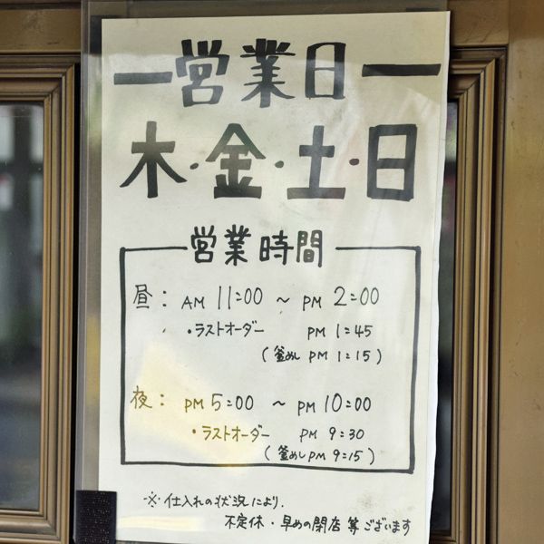木金土日の11時~14時/17時~22時営業(釜めしL.O.は昼夜とも終了45分前)。