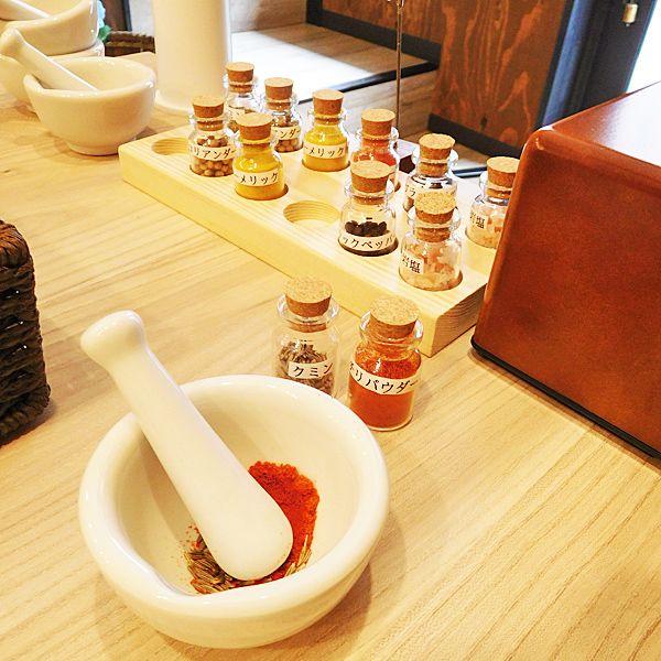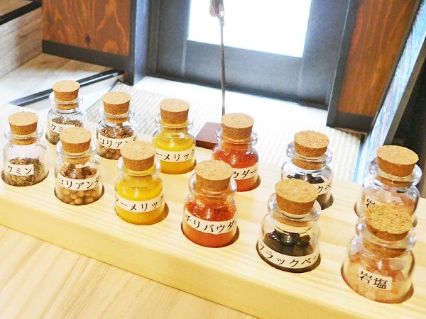 卓上にはかわいいスパイスの小瓶が並んでいて