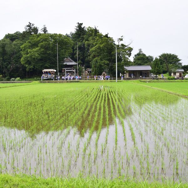 水が満ちた田んぼ、その向こうに御神輿と屋台。