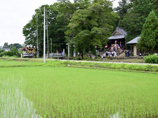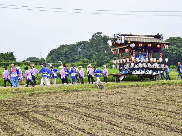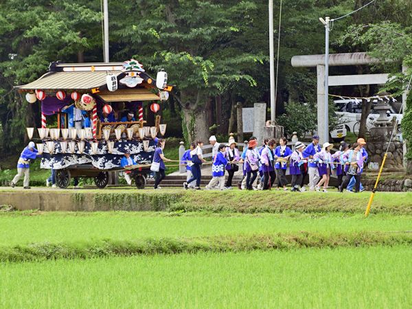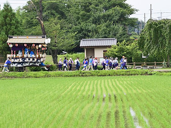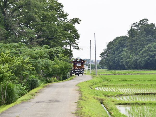 熊谷市板井(旧江南町)の夏祭りは小規模ながら、この田んぼ道を進む屋台が実に良い