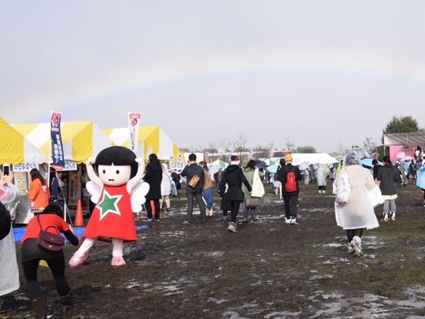 曇り空ながら「キャラ&虹」というメルヘンちっくな光景が。