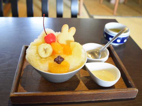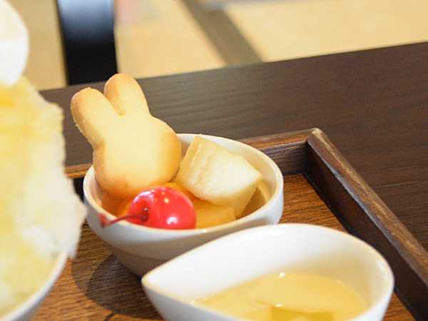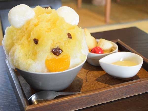 山盛り氷に、ちーず大福の耳やミカンの口などがついているのに