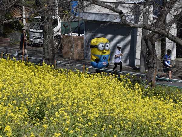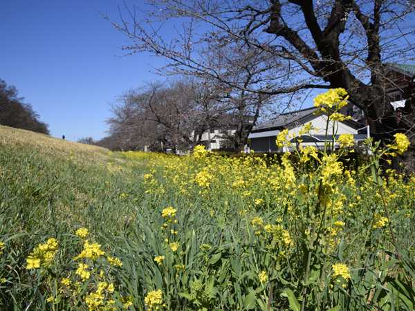 荒川神社前を通り抜け、ナノハナが咲く土手沿いを走る…