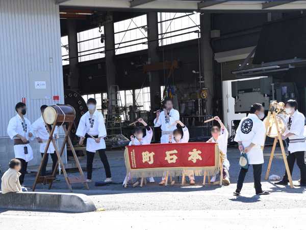 公園沿い、お囃子で応援する祇園会の皆さん。