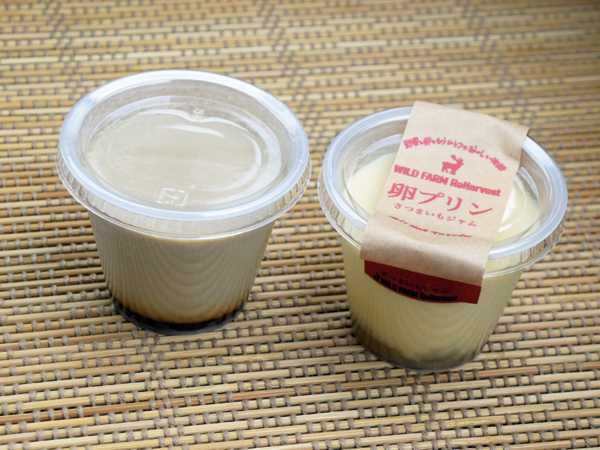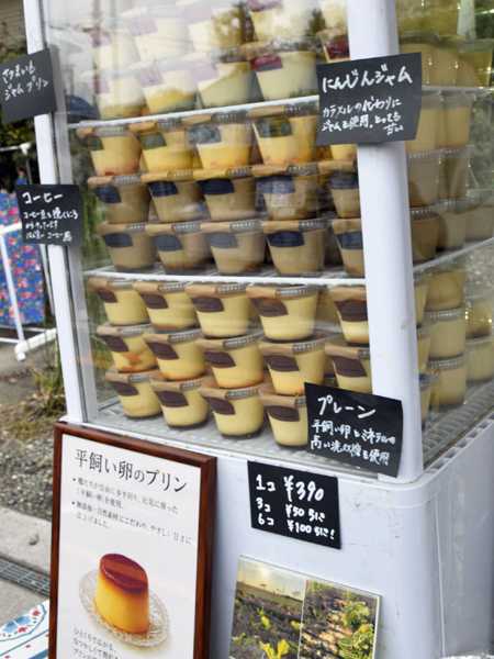 冷蔵ケースにみっちり積まれた平飼い卵のプリン、おいしそう!