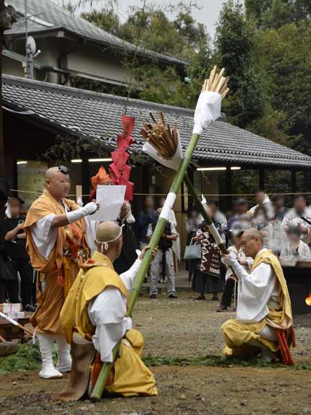 あれ…祈願文奉読、このフォーメーション初めて見たかも。妻沼聖天山秋季例大祭の2日目は火渡りを中心に拝見しつつ、午前中も少し様子見。※引き続きコメント欄を閉鎖中です、申し訳ありません。火渡りは毎年見物&掲載していますが、今年のお祭りの日は時間が多く取れたので、1日目に続いて2日目も午前中から見に行ったので2日目のことは2分割掲載とします。続きもすぐに公開します(^^)2日目の午前は、貴惣門と中門の間で学生さんの剣道大会が。何年も前に見たことあるけど、久しぶり!9時始まりで、まず「詩舞 実盛慕情」という舞いがあるようですが…その時間には間に合わず、というか着いた瞬間に終わった(^^;残念~!また来年以降を狙いますか…実盛公像の御前で、小学生と中学生かな?に分かれて2つの試合が同時進行。屋外での試合も気持ち良さそう。竹刀の音、懐かしいな…私は剣道やった事ないけど通ってた中学は剣道のスパルタ先生がいて、剣道部が強かったのさ。今回、2日目午前はもうひとつ催しが。石舞台にて「子供の狂言」ですと。(大人も出演)狂言は古典的喜劇、なかなか拝見する機会が無いね。いくつかの演目がある中、「附子(ぶす)」は有名で私も30年以上前に見たことがあるんだけどあまりに昔のことで、ストーリーを完全に忘れていて(^^;あ~はいはい、こういうコントみたいな展開だっけね。お子さま演者さんも、淀みない台詞回しで見事に演じ切って皆さんで、狂言の笑い方をみんなもやってみましょうタイム。ゆっくりと大仰に「うわ~~っ、はっ、はっ、はっ…」楽しい(^◇^)あとは午後からの火渡りですな。朝一番に見たときは準備始まりだった会場も、昼頃にはビシッと整備され15時、歓喜院本坊を出発した火渡り行者さん達が御入場。火渡り問答からの斧・矢・刀の儀式と続き…点火前の祈願文奉読の場面。読み上げる福院主様の前で、松明をクロスさせているね。これは初めて見たような気がする。年々ちょっとずつ細かいところが変わっている、大護摩供。点火されると、まずは炎よりも煙がすごいね。風向きによって、どちらに煙が来るか…これも修行です(^^;自分の方へ煙を運んできていただいたら脱帽・合掌・低頭のうえ、有り難くお受けしましょう。大勢の参拝客が見守る中、高く炎を燃え上がらせたらいよいよ火渡りの準備へ…「2日目その2」へ続きます。●当サイトのお祭り・イベント写真は、お顔にモザイクを施しています。→説明コチラ●当サイトの内容はブログ・facebook等 「ご自身で責任を持つサイト」以外には一切の例外なく転載 (抜粋・要約含め) 及びリンクを厳禁いたします。