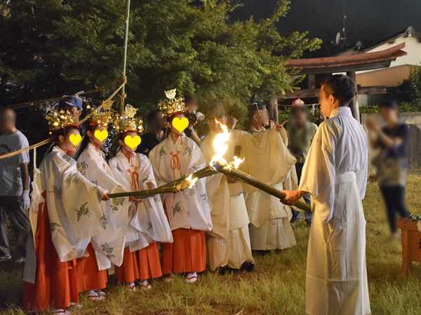 厳かにおこなわれた夏の最後の行事、暑い夜でしたな。8月27日の「大我井神社火祭り」を今年も拝見、今回は特別バージョンだったよ!※引き続きコメント欄を閉鎖中です、申し訳ありません。9日連続更新の後、いきなり半月も空くという不規則極まりないブログになっております(^^;火祭りも気付けば、もう1か月半も前の話になってしまいした…あの日は確か、昨年に続いて天気が微妙な日だったような。順延じゃないよね? と心配しながら行った大我井神社。たくさん並んだ提灯に灯りがともり、余興の音楽も聞こえている。予定どおり開催のようで、よかった(^^)(ちなみに確か、いつも2日間までは雨天順延あり・それで無理なら中止)19時過ぎ、巫女さんが行列スタンバイしいますが…あれ、今回は巫女さんの人数が多いね?毎年決まった年齢の近隣女子を4人集めているけどシャイなお年頃なので、近年は参加者を集めるのが大変と聞いていたのに。着いてから知ったんだけど、今回は明戸小学校(って深谷の明戸だよね?)の子たちを招いて拝殿内で舞を披露してくれるんですと!そんなわけで、リボン付きの神楽鈴や花飾りを持つ巫女さん達が参道を歩んできたよ…華やか御一行は拝殿に上がりまして…巫女舞の定番「豊栄の舞」と「浦安の舞」を披露。よく練習しているね、淀みなく進行してお見事まさか、この地でこんなの拝見できるとは思わなかったね。では、いつもの地元行事に戻りまして…改めて御入場~!神官様は、参道途中の御水屋でお清めをして。富士塚前に設置した祭壇にご挨拶し、護摩木の山を清めて昔ながらの火起こし器でキコキコキコ…時間をかけて火をおこして火を松明に移して、富士塚の上に運んで御祈祷の始まり…脇では雅楽の生演奏。これが楽しみ(^^)改めて、頂上から火を運んできて仕掛け花火に点火すると、一瞬にしてパパパパ~ン!!大きな音がするので、わかっていても毎回びっくりする(^^;色を変化させながらサ~ッと火花を注ぐ花火…に夢中になっているうちに下では、こんな素敵な場面が始まっている。松明の火を巫女さんの松明にも移して皆さんで会場をぐるり…その間にも頭上には、打ち上げ花火ど~ん!!あっちも見たいし、こっちも見たい…あわあわ(^^;松明の火で護摩木に点火すると一瞬にしてザ~ッと燃え上がる!熱い熱い、近くで見たいけど本当に熱いって(^^;ひとしきり燃え上がらせたら、消防隊の出番。ちょっとした放水ショー(?)を拝見したあとは火難よけの縁起物として、燃えかすを持ち帰るべし。これが終わると、夏祭りもひととおり終了ということで気が抜ける~。燃え尽きたのは護摩木だけではない、私もよ(笑)●当サイトのお祭り・イベント写真は、お顔にモザイクを施しています。→説明コチラ●当サイトの内容はブログ・facebook等 「ご自身で責任を持つサイト」以外には一切の例外なく転載 (抜粋・要約含め) 及びリンクを厳禁いたします。
