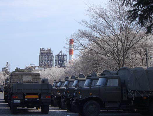 軍用車と桜…滅多に見られない組み合わせだわ♪4月8日は、航空自衛隊熊谷基地のさくら祭! その1週間前には夜桜公開もあって…今年は2回も自衛隊に潜入して、写真も撮りまくりィ去年は時間の都合でブルーインパルスの航空ショーだけ見てきたような感じだったけど、今回はもう、せっかく自衛隊の中に入れる機会だからと、入れる所をすみずみ~まで見物。国家機密の表面の薄皮一枚…の、そのまた3歩手前の写真(何じゃそりゃ)をこれから何日かに渡って載せまくっちゃうわよーーー!そんなワケで、いつもは味気ない自衛隊入口が、この日ばかりはこんな事になってます。門を入ってすぐ、ごく大ざっぱな持ち物検査。もちろん入っちゃいけないエリアも多くて黄色いテープが張り巡らされているけど、それでも広い広い!この日ばかりは屋台は出るわ、弁当持ち込みも人もいるわで、中に入っちゃえば好き放題♪でも、こんなお見事な桜並木が縦横無尽に続いてるんだから、この季節くらいは国民に解放しないとねえ(^^) ハンパな桜スポットより、よほど見応えあるよ。太平洋セメント(旧・秩父セメント)も、何だかすごく格好良く見える…一番奥にある広いグラウンドから…この角度で全容を見渡せるのはココだけだもんねえ。さあ、いよいよお楽しみの航空ショーよ!明日へ続く♪