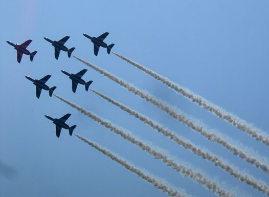 うわ~超・速い! カッコイイ! さっすがブルーインパルス♪昨日の続き…熊谷自衛隊のさくら祭をすみずみまでお見せしちゃいましょ~レポ。いよいよ花形・ブルーインパルスの航空ショーよ!!敷地内中央付近の広場を中心としておこなわれるショー、さすがにコレ目当ての人が多いね。去年は並男さんに撮ってもらったけど、今回は私が挑戦よ♪ロッケンロール♪なBGMが流れ、入間の基地から飛んでくるブルーインパルス6機…お~っキタ!!ピシッと横一直線に並んでカッコイイわあ…そして速いのなんのって!カメラ追いつかないよ~(^^; コレ追いかけて撮影するの、マジ難しいよ。色々と隊形を変えて飛んできて、その都度隊形の名前をアナウンスで説明してくれるんだけど、もう観る&撮るのに夢中で、名前憶えてられないよ~ん♪ちなみに、どっちの方向から進入してくるのかもアナウンスで教えてくれるよ。自衛官さん達も見守ってます。 当日はかなりの隊員さんがいるんだよね。よその基地からも派遣されるのかな? うおーっキターーー!! そして一瞬で行っちゃったーーー。うわ~近っ!! こんな接近状態での超高速飛行、こりゃ相当な技術がいるよ。観てるほうがコワいね。 互いの信頼関係がないと出来ないんだって…そうだよねえ。満開の桜の向こうを、ぐるっと旋回…カーブを描く飛行機雲がカッコイイね!太平洋セメント(旧・秩父セメント)の向こうから、単機進入! 一斉に丸を描いて、桜の花を形作る…お見事だけど、大きくて入りきらないよ~。そして 「皆様の幸せと平和を願って、大きなハートマークを描きます!」 という微妙に恥ずかしいナレーション(^^; ピッタリくっついてた2機が両サイドに分かれて弧を描きながら戻る…ほんとにハートマークだあは~…約20分だっけ?のショーは、あっという間。 でも見応えあったよ!比較的デキのイイ写真ばかり選んで載せてきたけどね…でも本当はね…こんなおマヌケな失敗写真のほうが多いんだよこれはまだマシ、飛行機写ってるもん。ほんとに「空だけ」とか…そんなのもいっぱい(爆)また明日へ続く自衛隊談議! でもその前に…今日はいよいよNHKのど自慢in熊谷!!昨日は予選もちょっとだけ覗いたし…今日テレビ観たら、またその話を書きますね♪