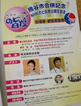日曜日はいよいよ 「NHKのど自慢」 が 熊谷会館からナマ放送だあ!! 日曜の12時15分にはNHKつけてみようね。明日が予選だけど、知人の中にも親分さんほか、出場する人がチラホラ…知った顔が本選に出ちゃうかも?? ドキドキもの。会場はウチのマンションから歩いてすぐだし、サンハイツの長老・山田おじいちゃんも「小林幸子がどこから来るんだげな?」 っつって、会館前で“入り待ち”する気だよそして、ちょうど今日このタイミングでキャッチした臨時ニュース。何と! 7月にはまた熊谷で…今度は旧・大里町の生涯学習センターにTV東京の「なんでも鑑定団」が来るんだってよ!出場者も募集してるから、詳細はコチラで御覧になってね♪江南町と合併→20万都市誕生記念って事で、最近やけに露出が多いわね~熊谷市。今年は他にもまだ何か、面白いことが待ち受けているのかな~??今日はこのお知らせのために、2コ目の日記…1コめの美味しいお菓子の話はコチラ!